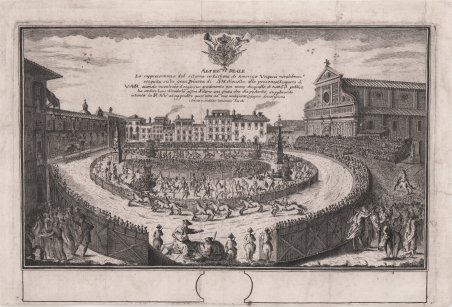 Acquaforte, 1795 circa, firmato “Vincenzio Tarchi”, alla fine del testo descrittivo in alto al centro. Si tratta, verosimilmente, di una prova di stampa della tavola destinata a corredare l’opera Firenze Antica, e Moderna Illustrata, tomo VI, di V. Follini, presso Anton Giuseppe Pagani & Comp., Firenze 1795, avanti il rimando alla pagina (pag. 381) e avanti i numeri di rimando alla legenda contenuta a pagina 382. Nel volume la lastra è così descritta: “Or tra le Feste fatte negli ultimi tempi quella di cui si dà il Rame è degna di ricordanza per la sfarzosità con la quale venne eseguita Rappresenta essa il ritorno in Lisbona di Amerigo Vespucci fingendosi il trionfo che conveniva a sì celebre Navigatore Essa fu eseguita ne giorni 2 1 26 e 29 Settembre alla presenza del Gran Duca Pietro Leopoldo poscia Imperatore di gloriosa ricordanza La Stampa in rame che dimostra tale Spettacolo esprime secondo i numeri le appresso significazioni tanto della Piazza suo ornato e Festa medesima Maria Novella.” La rappresentazione fu messa in scena il 21, 26 e 29 settembre, in occasione delle feste celebrate in onore di San Giovanni Battista, il santo patrono della città. L’opera Firenze Antica, e Moderna Illustrata, fu pubblicata in 8 tomi editi dal 1789 al 1802. ' Buona prova, impressa su carta vergata coeva, alcuni strappi restaurati, nel complesso in buono stato di conservazione. Etching, 1795 circa, signed “Vincenzio Tarchi”, at the end of the long description. This plate is probably a proof of the table designed to illustrate the work Firenze Antica, e Moderna Illustrata, tome VI, by V. Follini, edited by Anton Giuseppe Pagani & Comp., in Florence 1795. This proof is before the number in the upper right (page 381) and before the numbers referring to the legend contained on page 382. The spectacle was performed on 21, 26 and 29th of September, on the occasion of the feast of Saint John the Baptist, the city's patron saint. ' Good example, printed on contemporary laid paper, some restored tears, generally in good condition. Cfr.