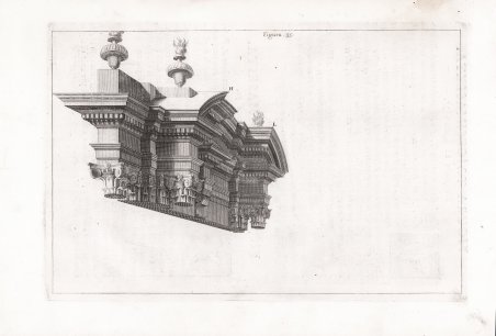 Tavola tratta dalla celebre PERSPECTIVA PICTORUM ET ARCHITECTORUM - PROSPETTIVA DE' PITTORI E ARCHITETTI. IN QUAE DOCETUR MODUS EXPEDITISSIMUS DELINEANDI OPTICÈ OMNIA QUE PERTINENT AD ARCHITECTURAM / IN CUI S’INSEGNA IL MODO PIÙ SBRIGATO DI METTERE IN PROSPETTIVA TUTTI I DISEGNI D’ARCHITETTURA, stampata da Giovanni Giacomo Komarek nel 1693. Trattato importantissimo nella storia della prospettiva poiché ideato in funzione dell’utilizzo pratico da parte dei pittori e degli architetti, con una esposizione semplice ed accurata, aiutata dall’utilizzo delle chiare tavole illustrative, con difficoltà crescenti: la prima parte tratta la teoria della prospettiva, la seconda rappresenta una guida pratica per il disegno prospettico in funzione pratica. Con il Pozzo la prospettiva torna ad essere materia artistica e non più scientifico-matematica come era stata affrontata nel ‘600. Le incisioni all’acquaforte sono di Vincenzo Mariotti allievo dell’Autore e Benoist Thieboust. L’opera ebbe un successo enorme e moltissime furono le edizioni. Andrea Pozzo, pittore, architetto e teorico della prospettiva (Trento 1642 - Vienna 1709). Lavorò dapprima a Milano, dove entrò nella Compagnia di Gesù, poi a Genova, a Venezia, nell’Emilia, a Mondovì e a Torino. Chiamato a Roma nel 1681, vi svolse un’intensa attività e vi compì il suo capolavoro: la grandiosa decorazione della tribuna e della volta di S. Ignazio, raffigurante la gloria del Santo (1685-91 ca.). Per invito di Leopoldo I si recò a Vienna nel 1703 e vi rimase sino alla morte. Bibliografia Cfr. Studi e documenti d’architettura, n. 9-10 - Riccardi, I,317-318. Plate taken from the PERSPECTIVA PICTORUM ET ARCHITECTORUM - PROSPETTIVA DE' PITTORI E ARCHITETTI. IN QUAE DOCETUR MODUS EXPEDITISSIMUS DELINEANDI OPTICÈ OMNIA QUE PERTINENT AD ARCHITECTURAM / IN CUI S’INSEGNA IL MODO PIÙ SBRIGATO DI METTERE IN PROSPETTIVA TUTTI I DISEGNI D’ARCHITETTURA, printed in Rome by Giacomo Komareck in 1693. A very important treatise in the history of perspective because it was conceived for the practical use of painters and architects, with a simple and accurate exposition, helped by the use of clear illustrative tables, with increasing difficulty: the first part deals with the theory of perspective, the second is a practical guide for perspective drawing. With Pozzo, perspective returns to being an artistic subject and no longer a scientific-mathematical one as it had been dealt with in the 1600s. The etchings are by Vincenzo Mariotti student of the author and Benoist Thieboust. The work was a huge success and there were many editions. Andrea Pozzo, painter, architect and perspective theorist (Trento 1642 - Vienna 1709). He worked first in Milan, where he joined the Società di Gesù, then in Genoa, Venice, Emilia, Mondovi and Turin. Called to Rome in 1681, he carried out an intense activity there and completed his masterpiece: the grandiose decoration of the tribune and the vault of S. Ignatius, depicting the glory of the Saint (1685-91 ca.). By invitation of Leopold I went to Vienna in 1703 and remained there until his death. Bibliografia Cfr. Studi e documenti d’architettura, n. 9-10 - Riccardi, I,317-318. Cfr.