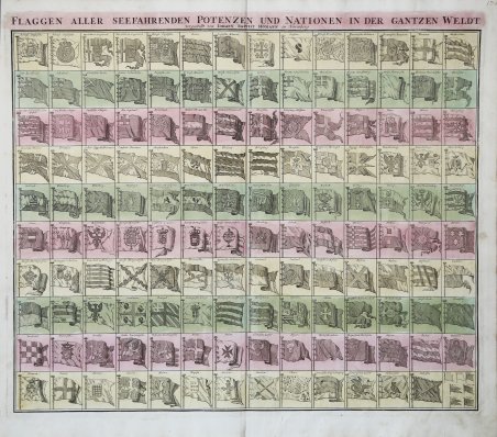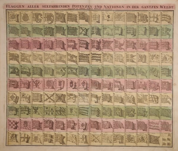 La tavola presenta 139 bandiere di varie nazioni, fazioni e compagnie commerciali. Tra le bandiere più interessanti ci sono quelle della Compagnia Olandese delle Indie Occidentali (G.W.C. /Geoctroyeerde Westindische Compagnie) e della Compagnia Olandese delle Indie Orientali (V.O.C. / Vereenigde Oostindische Compagnie). Il primo posizionamento delle bandiere inglesi nel quadrante superiore sinistro suggerisce che questa carta potrebbe essere stata copiata da una fonte inglese, anche se probabilmente derivata da una carta delle bandiere olandesi pubblicata da Cornelis Danckerts intorno al 1700. Johann Baptist Homann è stato un geografo e cartografo tedesco; nel 1702 fondò la sua casa editrice. Homann acquisì fama come uno dei principali cartografi tedeschi, e nel 1715 fu nominato geografo imperiale dall'imperatore Carlo VI. Nello stesso anno fu anche nominato membro dell'Accademia Prussiana delle Scienze a Berlino. Nel 1716 Homann pubblicò il suo capolavoro Grosser Atlas ueber die ganze Welt. Numerose mappe furono redatte in collaborazione con l'incisore Christoph Weigel. Homann morì a Norimberga nel 1724. Gli successe suo figlio Johann Christoph (1703-1730). L'azienda continuò dopo la sua morte come azienda degli eredi Homann, gestita da Johann Michael Franz e Johann Georg Ebersberger. Dopo successivi cambiamenti nella gestione, l'azienda si sciolse nel 1852. Acquaforte, con bella coloritura editoriale, un piccolo strappo nel margine bianco inferiore, per il resto in ottime condizioni. A very attractive flag chart issued by Johann Baprist Homann. The plate features 139 flags of various nations, factions, and trading companies. Among the more interesting flags are those of the Dutch West India Company (G.W.C. /Geoctroyeerde Westindische Compagnie) and the Dutch East India Company (V.O.C. / Vereenigde Oostindische Compagnie). The premier placement of English flags in the upper left quadrant suggest that this chart may have been copied from an English source. This map is probably derived from a Dutch flag chart issued by Cornelis Danckerts c. 1700. Johann Baptist Homann was a German geographer and cartographer; in 1702 he founded his own publishing house. Homann acquired renown as a leading German cartographer, and in 1715 was appointed Imperial Geographer by Emperor Charles VI. In the same year he was also named a member of the Prussian Academy of Sciences in Berlin. In 1716 Homann published his masterpiece Grosser Atlas ueber die ganze Welt; numerous maps were drawn up in cooperation with the engraver Christoph Weigel the Elder. Homann died in Nuremberg in 1724 and was succeeded by his son Johann Christoph (1703-1730). The company carried on upon his death as Homann heirs company, managed by Johann Michael Franz and Johann Georg Ebersberger. After subsequent changes in management the company folded in 1852. ' Etching with fine original colour, a small tear in the white bottom margin, otherwise in good condition. Cfr.
