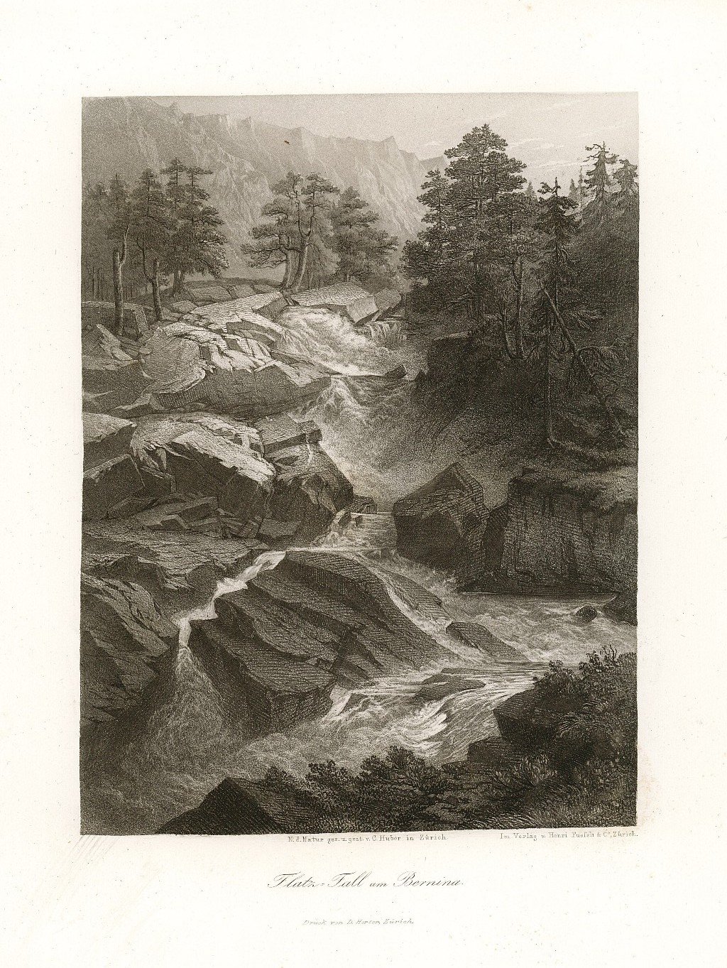 Bella e rara veduta della Cascata sul Bernina, inserita nell'opera "Album von St. Moritz in Oberengadin Ct. Graubunden" edito a Zurigo da Attenhofer & Comp. nel 1870 ca. Autore: Huber C. dis. e inc. & Attenhofer & Comp. edit. Luogo: Engadina - Bernina. Anno: 1870 ca. Tecnica: incisione su acciaio. Dimensioni: 229x171 mm