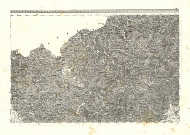 Carta geografica raffigurante la porzione di Toscana che longitudinalmente si estende da Camaiore, Garfagnano, valle del Serchio fino a Pistoia mentre nel senso della latitudine fino a Pievepelago. Gore specialmente ai margini