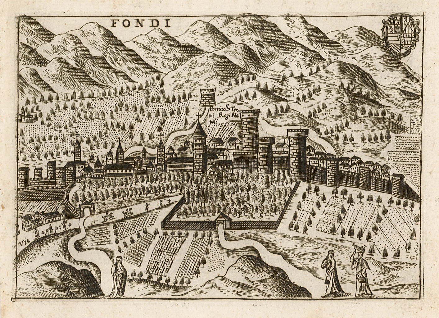 Stampa, antica ed originale, con veduta planimetrica prospettica della città e dei dintorni. Autore: Bertelli Francesco. Luogo: Fondi. Anno: 1629. Tecnica: incisione in rame. Dimensioni: 121x172.