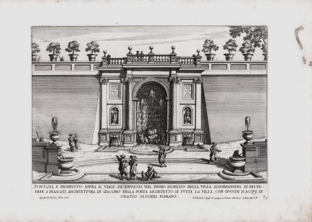 Tavola della serie ' “Le Fontane di Roma nelle Piazze, e luoghi publici della città ' e ' Le fontane delle ville di Frascati, nel Tusculano” dita da Giovanni Giacomo de Rossi ' alla Pace, senza data ma intorno al 1680. Falda, che muore a Roma nel 1678, incise le tavole del primo e del secondo volume, intitolati rispettivamente dal titolo ' Le Fontane di Roma nelle Piazze, e luoghi publici della città ' e ' Le fontane delle ville di Frascati, nel Tusculano. Le tavole del terzo e quarto volume, ' Le fontane ne' palazzi e ne' giardini di Roma ' e ' Le fontane del giardino Estense in Tivoli, furono, invece, incisi da Giovanni Francesco Venturini. Falda, nativo di Valduggia, all'età di 14 anni fu inviato a Roma ed affidato alle cure di uno zio che lo segnalò a Gian Lorenzo Bernini. Ma fu l'incontro con lo stampatore Giovanni Giacomo De Rossi a segnare una svolta nella carriera artistica del Falda: infatti il suo talento venne indirizzato dall'editore all'arte dell'incisione. Il suo tirocinio nella tipografia romana venne benevolmente accolto alla corte papale, tanto che Alessandro VII gli affidò l'incarico di disegnare le fabbriche della residenza di Castel Gandolfo. Nel 1665 Falda diede alle stampe per l'editore De Rossi il suo capolavoro: le tavole del primo libro del ' Nuovo Teatro delle fabbriche, et edificii, in prospettiva di Roma moderna sotto il felice pontificato di n. s. Alessandro VII, al quale seguirono, tra il 1665 e il '69, il secondo ed il terzo. L'opera aveva lo scopo di divulgare la nuova immagine di Roma: il Papa, infatti, decise di aprire nuove strade, di abbellire con fontane e monumenti la città, anche a dimostrazione della potenza finanziaria e culturale della sua famiglia. Con il ' Nuovo Teatro, come poi con le successive raccolte dedicate alle fontane e ai palazzi, Falda diventò il divulgatore di questi aspetti; le sue vedute incise, caratterizzate dall'attenzione sia alle regole prospettiche sia agli effetti scenografici, sfruttano abilmente il vigore della linea e la ricchezza del contrasto fra bianco e nero, in sintonia con i criteri spaziali dell'arte barocca. Acquaforte, impressa su carta vergata coeva, in ottimo stato di conservazione. Bibliografia The Illustrated Bartsch, vol. 47/2, pp.4-28. Olschki, Choix, XI, 16899; Rossetti 4830. Plate from the series ' Le Fontane di Roma, published by Giovanni Giacomo de Rossi alla Pace, undated but before 1680. Falda, who died in Rome in 1678, engraved the plates of the first and second volume, entitled respectively ' Le Fontane di Roma nelle Piazze, e luoghi publici della città ' and ' Le fontane delle ville di Frascati, nel Tusculano. The plates of the third and fourth volume, ' Le fontane ne' palazzi e ne' giardini di Roma ' and ' Le fontane del giardino Estense in Tivoli, were instead engraved by Giovanni Francesco Venturini. ' Falda, a native of Valduggia, at the age of 14 was sent to Rome and entrusted to the care of an uncle who pointed him out to Gian Lorenz Bernini. But it was the meeting with the printer Giovanni Giacomo De Rossi that marked a turning point in Falda's artistic career: in fact his talent was directed by the publisher to the art of engraving. His apprenticeship in the Roman printing house was well received at the papal court, so that Alexander VII entrusted him with the task of designing the buildings of the residence of Castel Gandolfo. In 1665 Falda printed for the publisher De Rossi his masterpiece: the tables of the first book of the ' Nuovo Teatro delle fabbriche, et edificii, in prospettiva di Roma moderna sotto il felice pontificato di n. s. Alessandro VII, which was followed, between 1665 and '69, by the second and third books. The work was intended to spread the new image of Rome: the Pope, in fact, decided to open new streets, to embellish the city with fountains and monuments, also to demonstrate the financial and cultural power of his family. With the ' Nuovo Teatro, ' as with the subsequent collections dedicated to fountains and palaces, Falda became the popularizer of these aspects. His etched views, characterized by attention to both the rules of perspective and the scenographic effects, skillfully exploit the vigor of the line and the richness of the contrast between black and white, in tune with the spatial criteria of Baroque art. Etching, printed on contemporary laid paper, in excellent condition. Bibliografia The Illustrated Bartsch, ' vol. 47/2, pp.4-28. Olschki, Choix, XI, 16899; Rossetti 4830. Cfr.