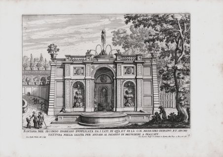 Tavola della serie ' “Le Fontane di Roma nelle Piazze, e luoghi publici della città ' e ' Le fontane delle ville di Frascati, nel Tusculano” dita da Giovanni Giacomo de Rossi ' alla Pace, senza data ma intorno al 1680. Falda, che muore a Roma nel 1678, incise le tavole del primo e del secondo volume, intitolati rispettivamente dal titolo ' Le Fontane di Roma nelle Piazze, e luoghi publici della città ' e ' Le fontane delle ville di Frascati, nel Tusculano. Le tavole del terzo e quarto volume, ' Le fontane ne' palazzi e ne' giardini di Roma ' e ' Le fontane del giardino Estense in Tivoli, furono, invece, incisi da Giovanni Francesco Venturini. Falda, nativo di Valduggia, all'età di 14 anni fu inviato a Roma ed affidato alle cure di uno zio che lo segnalò a Gian Lorenzo Bernini. Ma fu l'incontro con lo stampatore Giovanni Giacomo De Rossi a segnare una svolta nella carriera artistica del Falda: infatti il suo talento venne indirizzato dall'editore all'arte dell'incisione. Il suo tirocinio nella tipografia romana venne benevolmente accolto alla corte papale, tanto che Alessandro VII gli affidò l'incarico di disegnare le fabbriche della residenza di Castel Gandolfo. Nel 1665 Falda diede alle stampe per l'editore De Rossi il suo capolavoro: le tavole del primo libro del ' Nuovo Teatro delle fabbriche, et edificii, in prospettiva di Roma moderna sotto il felice pontificato di n. s. Alessandro VII, al quale seguirono, tra il 1665 e il '69, il secondo ed il terzo. L'opera aveva lo scopo di divulgare la nuova immagine di Roma: il Papa, infatti, decise di aprire nuove strade, di abbellire con fontane e monumenti la città, anche a dimostrazione della potenza finanziaria e culturale della sua famiglia. Con il ' Nuovo Teatro, come poi con le successive raccolte dedicate alle fontane e ai palazzi, Falda diventò il divulgatore di questi aspetti; le sue vedute incise, caratterizzate dall'attenzione sia alle regole prospettiche sia agli effetti scenografici, sfruttano abilmente il vigore della linea e la ricchezza del contrasto fra bianco e nero, in sintonia con i criteri spaziali dell'arte barocca. Acquaforte, impressa su carta vergata coeva, in ottimo stato di conservazione. Bibliografia The Illustrated Bartsch, vol. 47/2, pp.4-28. Olschki, Choix, XI, 16899; Rossetti 4830. Plate from the series ' Le Fontane di Roma, published by Giovanni Giacomo de Rossi alla Pace, undated but before 1680. Falda, who died in Rome in 1678, engraved the plates of the first and second volume, entitled respectively ' Le Fontane di Roma nelle Piazze, e luoghi publici della città ' and ' Le fontane delle ville di Frascati, nel Tusculano. The plates of the third and fourth volume, ' Le fontane ne' palazzi e ne' giardini di Roma ' and ' Le fontane del giardino Estense in Tivoli, were instead engraved by Giovanni Francesco Venturini. ' Falda, a native of Valduggia, at the age of 14 was sent to Rome and entrusted to the care of an uncle who pointed him out to Gian Lorenz Bernini. But it was the meeting with the printer Giovanni Giacomo De Rossi that marked a turning point in Falda's artistic career: in fact his talent was directed by the publisher to the art of engraving. His apprenticeship in the Roman printing house was well received at the papal court, so that Alexander VII entrusted him with the task of designing the buildings of the residence of Castel Gandolfo. In 1665 Falda printed for the publisher De Rossi his masterpiece: the tables of the first book of the ' Nuovo Teatro delle fabbriche, et edificii, in prospettiva di Roma moderna sotto il felice pontificato di n. s. Alessandro VII, which was followed, between 1665 and '69, by the second and third books. The work was intended to spread the new image of Rome: the Pope, in fact, decided to open new streets, to embellish the city with fountains and monuments, also to demonstrate the financial and cultural power of his family. With the ' Nuovo Teatro, ' as with the subsequent collections dedicated to fountains and palaces, Falda became the popularizer of these aspects. His etched views, characterized by attention to both the rules of perspective and the scenographic effects, skillfully exploit the vigor of the line and the richness of the contrast between black and white, in tune with the spatial criteria of Baroque art. Etching, printed on contemporary laid paper, in excellent condition. Bibliografia The Illustrated Bartsch, ' vol. 47/2, pp.4-28. Olschki, Choix, XI, 16899; Rossetti 4830. Cfr.
