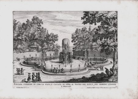 Tavola della serie ' “Le Fontane di Roma nelle Piazze, e luoghi publici della città ' e ' Le fontane delle ville di Frascati, nel Tusculano” dita da Giovanni Giacomo de Rossi ' alla Pace, senza data ma intorno al 1680. Falda, che muore a Roma nel 1678, incise le tavole del primo e del secondo volume, intitolati rispettivamente dal titolo ' Le Fontane di Roma nelle Piazze, e luoghi publici della città ' e ' Le fontane delle ville di Frascati, nel Tusculano. Le tavole del terzo e quarto volume, ' Le fontane ne' palazzi e ne' giardini di Roma ' e ' Le fontane del giardino Estense in Tivoli, furono, invece, incisi da Giovanni Francesco Venturini. Falda, nativo di Valduggia, all'età di 14 anni fu inviato a Roma ed affidato alle cure di uno zio che lo segnalò a Gian Lorenzo Bernini. Ma fu l'incontro con lo stampatore Giovanni Giacomo De Rossi a segnare una svolta nella carriera artistica del Falda: infatti il suo talento venne indirizzato dall'editore all'arte dell'incisione. Il suo tirocinio nella tipografia romana venne benevolmente accolto alla corte papale, tanto che Alessandro VII gli affidò l'incarico di disegnare le fabbriche della residenza di Castel Gandolfo. Nel 1665 Falda diede alle stampe per l'editore De Rossi il suo capolavoro: le tavole del primo libro del ' Nuovo Teatro delle fabbriche, et edificii, in prospettiva di Roma moderna sotto il felice pontificato di n. s. Alessandro VII, al quale seguirono, tra il 1665 e il '69, il secondo ed il terzo. L'opera aveva lo scopo di divulgare la nuova immagine di Roma: il Papa, infatti, decise di aprire nuove strade, di abbellire con fontane e monumenti la città, anche a dimostrazione della potenza finanziaria e culturale della sua famiglia. Con il ' Nuovo Teatro, come poi con le successive raccolte dedicate alle fontane e ai palazzi, Falda diventò il divulgatore di questi aspetti; le sue vedute incise, caratterizzate dall'attenzione sia alle regole prospettiche sia agli effetti scenografici, sfruttano abilmente il vigore della linea e la ricchezza del contrasto fra bianco e nero, in sintonia con i criteri spaziali dell'arte barocca. Acquaforte, impressa su carta vergata coeva, in ottimo stato di conservazione. Bibliografia The Illustrated Bartsch, vol. 47/2, pp.4-28. Olschki, Choix, XI, 16899; Rossetti 4830. Plate from the series ' Le Fontane di Roma, published by Giovanni Giacomo de Rossi alla Pace, undated but before 1680. Falda, who died in Rome in 1678, engraved the plates of the first and second volume, entitled respectively ' Le Fontane di Roma nelle Piazze, e luoghi publici della città ' and ' Le fontane delle ville di Frascati, nel Tusculano. The plates of the third and fourth volume, ' Le fontane ne' palazzi e ne' giardini di Roma ' and ' Le fontane del giardino Estense in Tivoli, were instead engraved by Giovanni Francesco Venturini. ' Falda, a native of Valduggia, at the age of 14 was sent to Rome and entrusted to the care of an uncle who pointed him out to Gian Lorenz Bernini. But it was the meeting with the printer Giovanni Giacomo De Rossi that marked a turning point in Falda's artistic career: in fact his talent was directed by the publisher to the art of engraving. His apprenticeship in the Roman printing house was well received at the papal court, so that Alexander VII entrusted him with the task of designing the buildings of the residence of Castel Gandolfo. In 1665 Falda printed for the publisher De Rossi his masterpiece: the tables of the first book of the ' Nuovo Teatro delle fabbriche, et edificii, in prospettiva di Roma moderna sotto il felice pontificato di n. s. Alessandro VII, which was followed, between 1665 and '69, by the second and third books. The work was intended to spread the new image of Rome: the Pope, in fact, decided to open new streets, to embellish the city with fountains and monuments, also to demonstrate the financial and cultural power of his family. With the ' Nuovo Teatro, ' as with the subsequent collections dedicated to fountains and palaces, Falda became the popularizer of these aspects. His etched views, characterized by attention to both the rules of perspective and the scenographic effects, skillfully exploit the vigor of the line and the richness of the contrast between black and white, in tune with the spatial criteria of Baroque art. Etching, printed on contemporary laid paper, in excellent condition. Bibliografia The Illustrated Bartsch, ' vol. 47/2, pp.4-28. Olschki, Choix, XI, 16899; Rossetti 4830. Cfr.