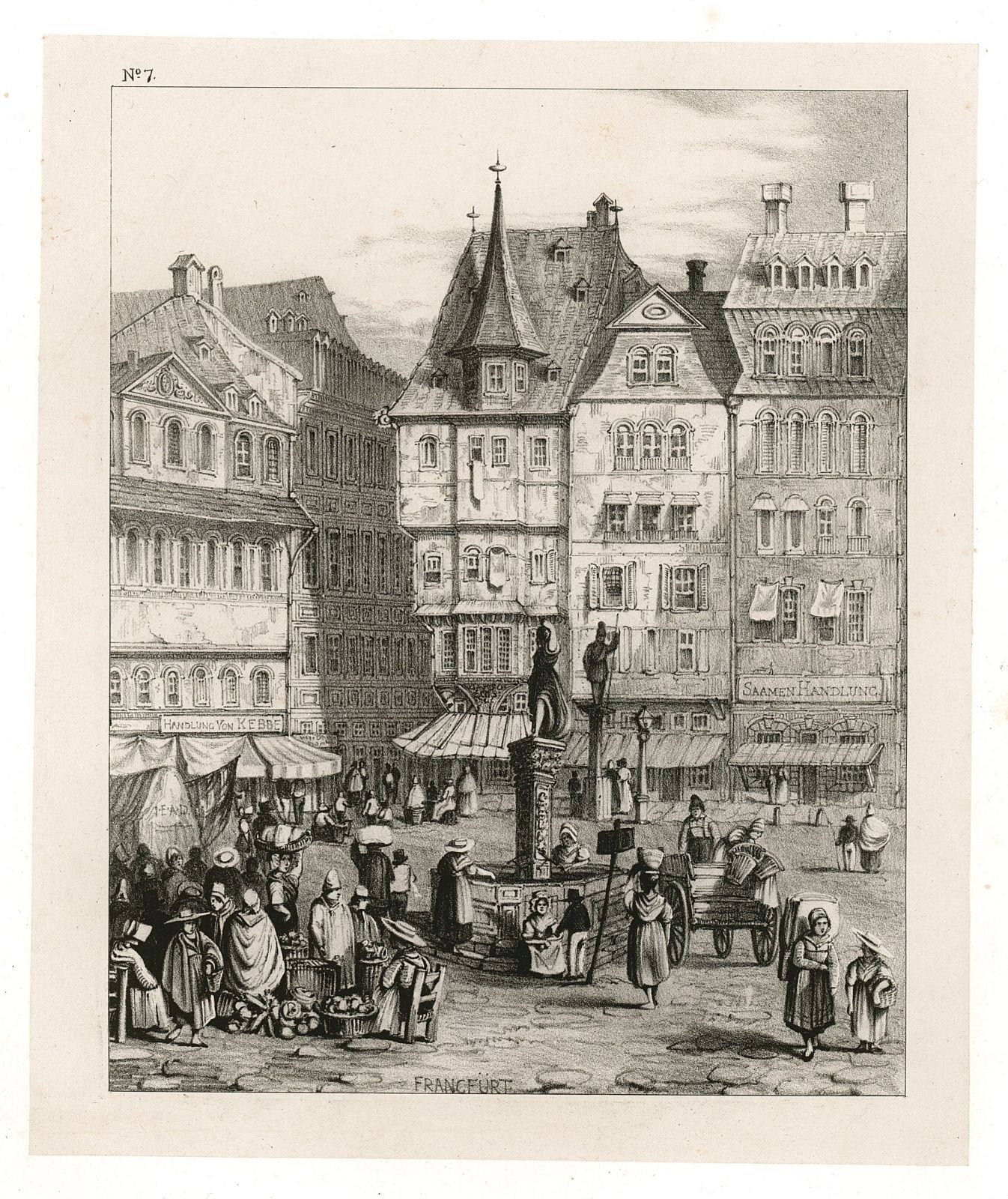 Litografia, antica ed originale stampata su carta cina, raffigurante la città di Francoforte. fecente parte della deliziosa raccolta di 40 litografie che ritraggono scorci e vedute di villaggi e città da Ghent a Francoforte, Verona, Bologna, Firenze, Roma e Genova, ecc. a titolo "Italy, Switzerland, Belgium. a series of original drawings on stone by I.E.A. Dolby" pubblicata a Londra nel gennaio del 1836.