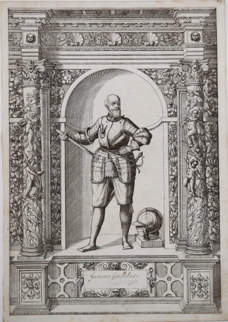 Ritratto di Francesco Castellalto. Bulino, 1601, da Giovan Battista Fontana. Ottima prova, impressa su carta vergata coeva, con margini, in buono stato di conservazione. Testo latino al verso, prima edizione. Tavola tratta da Augustissimorum Imperatorum . regum . verissimae immagina… (noto anche come Armamentarium Heroicum), il catalogo della collezione di armi dell'Arciduca Ferdinando II, conservato nel castello di Ambras; venne pubblicato per la prima volta a Innsbruck nel 1601. Fu illustrato con un frontespizio e 125 ritratti di principi europei in armatura completa, inseriti in una ricca cornice ornamentale. Le lastre furono incise da Domenico Custos su disegno di Giovanni Battista Fontana. Ogni tavola era accompagnata da un breve testo biografico scritto da Jacob Schrenk von Notzing. Una traduzione tedesca del libro (di J. E. Noyse von Campenhouten) è stata pubblicata nel 1603 con il titolo Der Aller Durchleuchtigisten und Grossmächtigen Kayser, Durchleuchtigisten unnd Großmächtigen Königen[.]. Una terza edizione, comprendente 123 tavole, fu stampata a Innsbruck nel 1605. Portrait of Francesco Castellalto, full-length, facing front, wearing armour, holding a baton in his right hand, his left hand on his hip; within a niche, flanked on either side by decorated Corinthian columns. Engraving, circa 1601. A fine impression, printed on contemporary laid paper, with margins, good condition. Latin text on verso, first edition. Plate from Augustissimorum Imperatorum . regum. verissimae imagines… (also known as Armamentarium Heroicum), the catalogue of the arms collection Archduke Ferdinand II kept at Ambras castle; it was first published in Innsbruck in 1601. It was illustrated with a frontispiece and 125 portraits of European princes in full armour, with decorative surroundings. The plates were engraved by Dominicus Custos after designs by Giovanni Battista Fontana. Each plate was accompanied by a short biographical text on the former owner of the armour, written by Jacob Schrenk von Notzing. A German translation of the book (by J. E. Noyse von Campenhouten) was published in 1603 under the title Der aller Durchleuchtigisten und Grossmächtigen Kayser, Durchleuchtigisten unnd Großmächtigen Königen[.]. A third edition including 123 plates was issued in Innsbruck in 1605. Cfr. Hollstein 60. Hollstein 60.