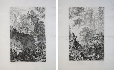 UNA RARISSIMA PROVA DI STAMPA DEL PRIMO STATO ' Acquaforte, bulino e puntasecca, circa 1745/48, firmata in basso a destra, nel foglio di destra. Esemplare nel primo stato di sette descritto da Hind prima dell’aggiunta dell'indirizzo degli editori Bouchard e Gravier e dei ritocchi a bulino sullo sfondo. L’esemplare in questione tuttavia è da considerarsi come una rarissima prova di stampa su due fogli separati, dividendo l’opera a metà e realizzando due composizioni fini a se stesse. L’allegoria con la statua della Minerva costituirà il secondo frontespizio alle Vedute di Roma. Il lavoro viene datato dagli studiosi al periodo 1745/48, quindi venne realizzato prima del primo frontespizio all’opera, che è datato in lastra 1748. Per la realizzazione delle due composizioni, ottenute mediante la stampa dell’intera lastra, si servì molto probabilmente di una “mascherina”, riuscendo così a stampare solo metà della lastra. ' Il periodo in cui tutto ciò avviene lascia supporre che si tratti di un qualcosa di voluto e non di una semplice prova di stampa. Il soggetto – il capriccio – e le misure indicano come l’artista con questa prova di stampa, prosegua il lavoro che aveva iniziato nel 1743, con le prime tavole di Prima Parte di Architetture e Prospettive. Secondo Hind una prova di questo lavoro era presente inclusa nelle Opere Varie - nuovo titolo dato dal Piranesi alla Prima Parte di Architetture e Prospettive a partire dal 1750 - della King's Library, a conferma che il Piranesi usò la lastra per realizzare due nuovi lavori deposit a continuare Prima parte di Architetture e Prospettive. ' Prima parte di Architetture e Prospettive è una pubblicazione del giovane Piranesi, appena stabilitosi a Roma. Il risultato è un’opera non del tutto unitaria, caratterizzata dalla notevole differenza stilistica tra le tavole, ma dal grande fascino e che lascia intuire e prevedere i futuri sviluppi artistici. Il lavoro continua una tradizione di un modello ormai affermato, che prevedeva il capriccio e la veduta, la scenografia ed il trattato di architettura, ma in seguito, analizzando la biografia dell’artista si comprenderà essere soprattutto lo sfogo di una crisi come architetto e di un itinerario interiore vissuto con intensità. Insomma il frutto dello scontro di una mente legata alla cultura veneziana erede della poesia delle rovine evocata da Marco Ricci e ripresa dal Bellotto e dal Canaletto, e la nuova cultura architettonica che si andava formando nel giovane Piranesi. Prima parte di Architetture e le successive fantasie architettoniche che la continuano costituiscono un passo decisivo verso lo scopo che egli si prefiggeva nella prefazione all’opera: far si che il capriccio architettonico portasse a liberare l’architettura dalle catene del mondo materiale e sociale, per farne un’arte veramente liberale. Immediato fu il successo di pubblico che riscosse il lavoro. Come detto la prima stesura dell’opera è databile al 1743, e venne dedicata a Nicola Giobbe, grande impresario al servizio della Camera Apostolica e protettore del giovane architetto veneziano. In seguito la stessa fu inserita in un più ampio discorso che comprendeva anche i quattro Capricci e pubblicata nelle Opere Varie di Architettura Prospettive Grotteschi Antichità ' Inventate ed incise da Giambattista Piranesi Architetto Veneziano stampata da Giovanni Bouchard nel 1750. Magnifica prova, impressa a inchiostro nero su due fogli separati, su carta vergata coeva con filigrana "cerchio e giglio con lettere CB" (Robison 2 nel solo foglio di destra), con ampi margini, tracce delle consueta piega centrale orizzontale, nel complesso in eccellente stato di conservazione. Opera di grandissima rarità. ' Dimensioni: 322x495 mm il foglio di sinistra e 330x495 mm il foglio di destra. Bibliografia cfr. A. M. Hind, Giovanni Battista Piranesi. A critical study with a list of his published works and detailed catalogu. A VERY RARE PROOF OF THE FIRST STATE Etching, engraving and drypoint, circa 1745/48, signed at lower right, in the right sheet. Example in the first state of seven described by Hind before the addition of the address of the publishers Bouchard and Gravier and the retouches in the background. The example in question, however, is to be considered as a very rare printing proof on two separate sheets, dividing the work in half and making two compositions for their own sake. ' The Allegory with the statue of Minerva will constitute the second title page to the Vedute di Roma. The work is dated by scholars to the period 1745/48, therefore it was realized before the first frontispiece to the work, which is dated on the plate 1748. For the realization of the two compositions, obtained by printing the entire plate, he most likely used a "mask", thus managing to print only half of the plate. ' The period in which all this took place suggests that it was something intentional and not a simple test. The subject - the caprice - and the measurements indicate that with these proofs the artist continued the work he had begun in 1743, with the first plates of the Prima parte di Architetture e Prospettive According to Hind, a proof of this work was included in the Opere Varie - the new title given by Piranesi to the Prima parte di Architetture e Prospettive from 1750 onwards - in the King's Library, confirming that Piranesi used the plate to make two new works to continue the Prima parte di Architetture e Prospettive. Prima parte di Architetture e Prospettive is a publication by the young Piranesi, who had just settled in Rome. The result is a work that is not entirely unified, characterized by the notable stylistic difference between the plates, but of great charm and that lets you guess and predict future artistic developments. The work continues a tradition of a well-established model, which included the whim and the view, the scenography and the treatise on architecture, but later, analyzing the artist's biog