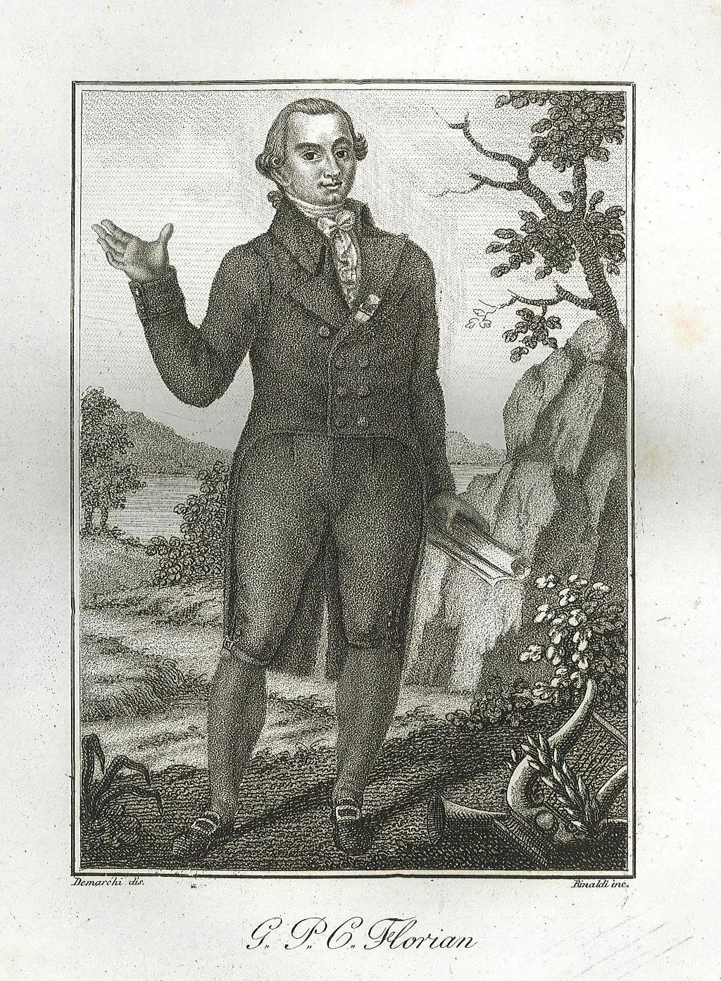Stampa antica originale raffigurante il ritratto del poeta e scrittore francese Jean-Pierre Claris de Florian, in allegato pagina descrittiva. Gore e ingiallimento ai margini della stampa. Inserita nell'opera "Serie di vite e ritratti de Famosi Personaggi degli ultimi Tempi" edita da Bettalli e Fanfani a Milano dal 1815 al 1818