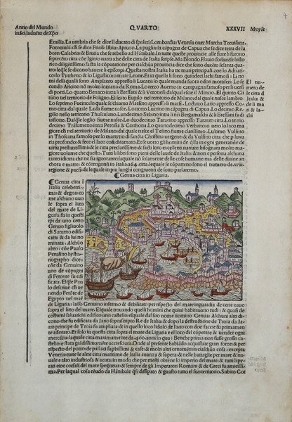 Pagina contenente una piccola veduta xilografica della città, rappresentata con molti elementi di fantasia. Foglio tratto dal celebre ' Supplementum chronicarum orbis ab initio mundi ' di Giacomo Filippo Foresti. Il ' Supplementum ' è una narrazione per annate in 15 libri contenente una sorta di storia universale del mondo dall’origine fino al 1482. Nel 1483 fu stampato per la prima volta a Venezia e dedicato alla Magnifica Comunità di Bergamo. Il ' Supplementum ' è una sorta di storia generale che si propone di raccogliere in un unico libro le notizie meritevoli di esser tramandate ai posteri, sparse fino a quel momento in disparati testi. La narrazione procede per annate, secondo un rigoroso ordine cronologico: nella prima edizione l'opera constava di quindici libri, nell'edizione del 1503 il Foresti aggiunse un sedicesimo libro contenente gli avvenimenti degli ultimi venti anni. Successivamente aggiornata più volte; complessivamente sono conosciute sei edizioni incunabolo e sei stampate nel ‘500, di cui l’ultima nel 1553. La prima edizione in italiano è stampata a Venezia nel 1535, e da questa è tratta questa pagina. Le tavole xilografiche raffiguranti le città compaiono per la prima volta nel 1513 e vengono implementate nel numero con il susseguirsi delle edizioni. Il ' Supplementum Chronicarum (in omnimoda historia novissime congesta) ha come principale fonte i ' Genealogiae deorum gentilium libri ' e il ' Chronicon ' di S. Antonino. Giacomo Filippo di Bergamo (lat. Bergomensis 1434-1520), fu eremita religioso agostiniano. Appartenente alla nobile famiglia dei conti Foresti, Jacopo entro nell'Ordine degli eremitani di S. Agostino, e fu priore a Imola e a Forlì. Xilografia, finemente colorata a mano, in ottimo stato di conservazione. Bibliografia Pianetti Elisa, ' Fra’ Jacopo Filippo Foresti nel quadro della cultura bergamasca, in “Bergomum” Bollettino della Civica Biblioteca vol.2, 1939. Page containing a small woodcut view of the city, depicted with many fantasy elements. Sheet from the famous ' Supplementum chronicarum orbis ab initio mundi ' by Giacomo Filippo Foresti. The ' Supplementum ' is a narrative for annals in 15 books containing a kind of universal history of the world from its origin to 1482. In 1483 it was first printed in Venice and dedicated to the Magnifica Comunità di Bergamo. The ' Supplementum ' is a kind of general history that aims to collect in a single book the news worthy of being handed down to posterity, scattered up to that time in disparate texts. The narrative proceeds by years, in strict chronological order: in the first edition the work consisted of fifteen books; in the 1503 edition Foresti added a sixteenth book containing the events of the last twenty years. Subsequently updated several times; a total of six incunable editions are known and six printed in the 1500s, the last of which was in 1553. The first Italian edition is printed in Venice in 1535, and this page is taken from it. The woodcut plates depicting the cities first appear in 1513 and are implemented in number as editions follow. The ' Supplementum Chronicarum (in omnimoda historia novissime congesta) has as its main source the ' Genealogiae deorum gentilium libri ' and the ' Chronicon ' of St. Antoninus. Giacomo Filippo of Bergamo (lat. ' Bergomensis 1434-1520), was an Augustinian religious hermit. A member of the noble family of Count Foresti, Jacopo entered the Order of the Hermits of St. Augustine, and was prior in Imola and Forli. Woodcut, finely hand-colored, in excellent condition. Bibliografia Pianetti Elisa, ' Fra’ Jacopo Filippo Foresti nel quadro della cultura bergamasca, in “Bergomum” Bollettino della Civica Biblioteca vol.2, 1939. ' Cfr. Cremonini pp. 7/9, 2, 1.