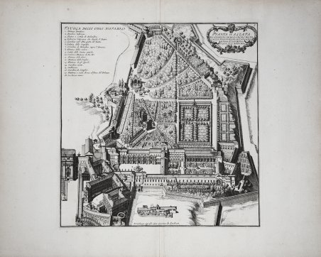 Tavola tratta dal ' Li giardini di Roma, disegnati da Giovanni Battista Falda…nuovamente dati alle stampe con direttione di Giov. Giacomo de Sandrart, ' edita a Norimberga da J. Von Sandrart intorno al 1685 circa. Questo lavoro di Sandrart deriva dalla famosa opera di Giovan Battista Falda ' Li Giardini di Roma con le loro piante alzate e vedute in prospettiva disegnate ed intagliate da Gio. Battista Falda, curato da Gian Giacomo de Rossi qualche anno prima (la prima edizione fu pubblicata sicuramente dopo il 1677 ma prima del 1683) che comprendeva 19 tavole di piante e vedute prospettiche dei più celebri giardini romani di cui 14 incise da G.B. Falda e 5 da Simon Felice. Le tavole di questa edizione tedesca, numerate in cifre romane, vennero tutte incise sulla base di quelle originarie, con poche varianti, ben evidenti dal confronto tra le due opere.Sorprende, pertanto, che spesso quest’opera di Sandrart circoli erroneamente sotto il nome di Falda quale autore; sbaglia anche Paolo Bellini in TIB affermando che Sandrart utilizzò due rami originali di Falda. Per le sue incisioni, il Sandrart si avvalse dei suoi collaboratori Karl Gustav von Amling (1650-1703); Philip Kilian (1628-1693); Richard Collin (1627-97); Georg Andreas Wolfgang (1631-1716); Johann Georg Waldreich (d.1680); Melchior Küsel (1626-1683); Franck, Johann (fl.1659-1690); George Christoph Eimmart (1638-1705); Susanna Maria von Sandrart (1658-1716); Bartholomäus Kilian (1630-1696). Joachim von Sandrart fu un pittore di una certa importanza, ma è per la sua ' Teutsche Academie ' che è principalmente ricordato. Il suo compendioso trattato include sezioni sulla scultura antica e l'architettura, la prospettiva, la teoria della pittura, biografie di artisti, una traduzione delle Metamorfosi di Ovidio e così via. La seconda parte del Libro I pretende di dare una storia dell'arte dalle sue prime origini, e si apre con un'incisione di due scene di racconti leggendari della scoperta del disegno. Acquaforte, con margini, ottimo stato di conservazione. Bibliografia National Gallery (Washington), ' Mark J. Millard, III (1998), no. 111; F.W. H. Hollstein, ' German engravings . ca. 1400-1700 ' (1954-), 38-41; Anna Schreurs, ' Unter Minerva schutz: bildung durch kunst in Joachim von Sandrarts 'Teutscher Academie' ' (2012). Plate taken from ' Li giardini di Roma, disegnati da Giovanni Battista Falda.nuovamente dati alle stampe con direttione di Giov. Giacomo de Sandrart, published in Nuremberg by J. Von Sandrart around 1685 circa. This work by Sandrart derives from the famous ' Li Giardini di Roma con le loro piante alzate e vedute in prospettiva disegnate ed intagliate da Gio. Battista Falda, edited by Gian Giacomo de Rossi a few years earlier (the first edition was certainly published after 1677 but before 1683) which included 19 plates of maps and perspective views of the most famous Roman gardens, 14 of which were engraved by G.B. Falda and 5 by Simon Felice. The plates of this German edition, numbered in Roman numerals, were all engraved on the basis of the original ones, with a few variations, clearly evident in the comparison between the two works. It is surprising, therefore, that this work by Sandrart is often mistakenly circulated under the name of Falda as the author; Paolo Bellini is also wrong in TIB stating that Sandrart used two original plaets by Falda. For the plates Sandrart used his students as and many others artist as ' Karl Gustav von Amling (1650-1703); Philip Kilian (1628-1693); Richard Collin (1627-97); Georg Andreas Wolfgang (1631-1716); Johann Georg Waldreich (d.1680); Melchior Küsel (1626-1683); Franck, Johann (fl.1659-1690); George Christoph Eimmart (1638-1705); Susanna Maria von Sandrart (1658-1716); Bartholomäus Kilian (1630-1696). Joachim von Sandrart was a painter of some note but it is for his ' Teutsche Academie ' that he is chiefly remembered. His compendious treatise includes sections on ancient sculpture and architecture, perspective, the theory of painting, artists’ biographies, a translation of Ovid’s Metamorphoses and so on. The second part of Book I purports to give a history of art from its earliest origins, and opens with an engraving of two scenes of legendary accounts of the discovery of drawing. Etching with margins, very good condition. References National Gallery (Washington), ' Mark J. Millard, III (1998), no. 111; F.W. H. Hollstein, ' German engravings . ca. 1400-1700 ' (1954-), 38-41; Anna Schreurs, ' Unter Minerva schutz: bildung durch kunst in Joachim von Sandrarts 'Teutscher Academie' ' (2012). Cfr.