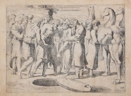 Acquaforte, circa 1607, firmata in lastra. Bellissima prova, con pieni margini, alcuni strappi nei margini bianchi dove sono presenti delle leggere gore d’acqua che non intaccano la parte incisa, per il resto in buono stato di conservazione. La tavola appartiene alla famosa Bibbia di Raffaello, incisa da Sisto Badalocchio e Giovanni Lanfranco, dal titolo Historia del Testamento Vecchio dipinta in Roma nel Vaticano da Raffaello da Urbino et intagliata in rame da Sisto Badalocchi et Giovanni Lanfranchi Parmigian. Al Sig. Annibale Carracci. In Roma appresso a Giovanni Orlandi. Con licenza de' Superiori. 1607. La serie fu realizzata intorno al 1607 a Roma, dove i due artisti erano allievi di Annibale Carracci; 28 delle tavole sono incise da Lanfranco, 23 da Badalocchio. Le opere derivano dagli affreschi di Raffaello nella loggia del Vaticano. Scrive Michael Bury in The Print in Italy, BM 2001, cat.90: “The etchings reverse Raphael's compositions. Mussini noted a tendency to simplification and alteration, especially in Badalocchio (Mussini, 1979, p.61); Borea suggested that the prints are the result of some critical reflection (1986, p.xvi). In the plate shown here, the spatial structure is substantially altered by cutting the height of the scene, making Isaac's head almost touch the top edge. This is in line with what is done in many others, by Sisto Badalocchio as well as Lanfranco. The effect is to increase the size and impact of the figures, for it is their movements and their relationships with one another that are at the centre of attention. The long dedication to Annibale Carracci reveals that the drawings had been made during the previous summer, while the Pope was away from the Vatican. Annibale's illness had prevented Badalocchio and Lanfranco from studying with him, and, keen to pursue their studies during this period, they had turned to the work of Raphael, whom Annibale always praised so much. They had now decided to publish their drawings for the benefit of young students of painting who live far away, executing them in etching 'for greater speed' ("per maggiore prestezza"). It is pointed out that not everyone has appreciated the Loggie frescoes as much as they deserve, believing them to have only been designed by Raphael; however for the variety of the inventions and for their sublime subjects they are worthy of the highest regard. Ginzburg Carignani (1996, p.130 and n.112) has shown that the preface was not in fact written by the two pupils, but by G.B.Agucchi (1570-1632) the patron and writer on art. Agucchi was a great champion of the Carracci and of Annibale in particular, seeing them as the reformers who had restored painting to the true path marked out first by the ancients and then, in modern times, by Raphael”. Plate of the Raphael Bible etched by Badalocchio and Lanfranco, titled Historia del Testamento Vecchio dipinta in Roma nel Vaticano da Raffaello da Urbino et intagliata in rame da Sisto Badalocchi et Giovanni Lanfranchi Parmigian. Al Sig. Annibale Carracci. In Roma appresso a Giovanni Orlandi. Con licenza de' Superiori. 1607. The series consists of 54 plates, a frontispiece and three etched plates with dedicatory text to Annibale Carracci and 50 plates after Raphael that are numbered from 5 to 54. The set was made when the two etchers were both young pupils of Carracci in Rome in 1607 and were said to have been made to try to lift him out of depression; 28 plates are by Lanfranco (Bartsch XVIII.345.1 to 28) and 23 (including the frontispiece) by Badalocchio (Bartsch XVIII.354.1 to 23). From Michael Bury, The Print in Italy, BM 2001, cat.90: “The etchings reverse Raphael's compositions. Mussini noted a tendency to simplification and alteration, especially in Badalocchio (Mussini, 1979, p.61); Borea suggested that the prints are the result of some critical reflection (1986, p.xvi). In the plate shown here, the spatial structure is substantially altered by cutting the height of the scene, making Isaac's head almost touch the top edge. This is in line with what is done in many others, by Sisto Badalocchio as well as Lanfranco. The effect is to increase the size and impact of the figures, for it is their movements and their relationships with one another that are at the centre of attention. The long dedication to Annibale Carracci reveals that the drawings had been made during the previous summer, while the Pope was away from the Vatican. Annibale's illness had prevented Badalocchio and Lanfranco from studying with him, and, keen to pursue their studies during this period, they had turned to the work of Raphael, whom Annibale always praised so much. They had now decided to publish their drawings for the benefit of young students of painting who live far away, executing them in etching 'for greater speed' ("per maggiore prestezza"). It is pointed out that not everyone has appreciated the Loggie frescoes as much as they deserve, believing them to have only been designed by Raphael; however for the variety of the inventions and for their sublime subjects they are worthy of the highest regard. Ginzburg Carignani (1996, p.130 and n.112) has shown that the preface was not in fact written by the two pupils, but by G.B.Agucchi (1570-1632) the patron and writer on art. Agucchi was a great champion of the Carracci and of Annibale in particular, seeing them as the reformers who had restored painting to the true path marked out first by the ancients and then, in modern times, by Raphael. Etching, printed on contemporary laid paper, with full margins showing tears at waterstains, otherwise good condition. Cfr. TIB.40.11