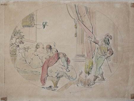 Acquaforte, 1799, firmata dall'artista nella lastra in basso a sinistra con "J H Ramberg fec.". Il foglio mostra una coppia di amanti su un divano. Un altro uomo entra nella scena, apre la tenda e sorprende gli amanti. Ai suoi piedi c'è un piccolo cane, un pappagallo siede davanti alla sua gabbia. Johann Heinrich Ramberg è stato un pittore e satirico tedesco. Come disegnatore, caricaturista e illustratore (di libri), soprattutto di opere letterarie, amici e conoscenti di importanti editori e poeti, "era tra i grandi del suo tempo". Etching, 1799, signed by the artist in the plate lower left with "J H Ramberg fec.". The sheet shows on an oval ground plan a pair of lovers on a divan. Another man enters the scene, opens the curtain and surprises the lovers. At his feet is a small dog, a parrot sits in front of its cage. Johann Heinrich Ramberg - (1763 near Hannover - 1840 Hannover) was a German painter and satirist. As a draftsman, caricaturist and (book) illustrator, especially to literary works, friends and acquaintances with important publishers and poets, "he counted among the greats of his time. Cfr.