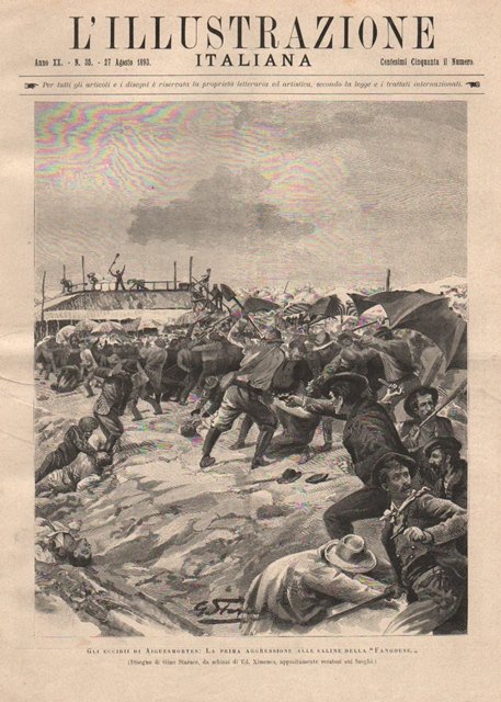 Veduta della carneficina del 17 agosto ad Aigues-Mortes, luogo di scontro tra operai francesi e italiani delle saline. Testo al retro