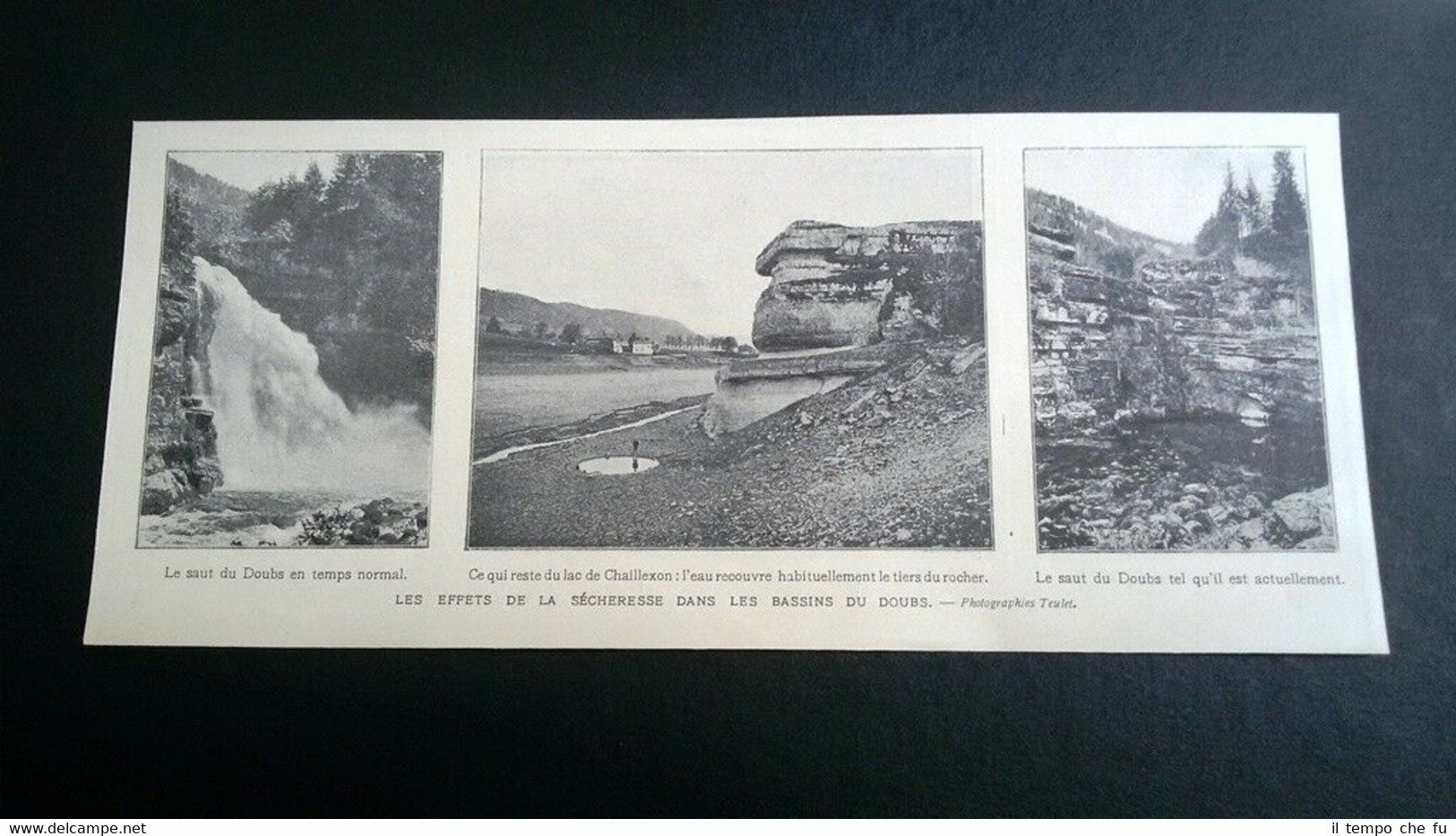 Rara stampa estratta da pubblicazione del 1906. .stampa che ha quindi oltre 112 anni! Gli effetti della siccità nei bacini del Doubs Il salto del Doubs in tempi normali Quel che resta del lago di Chaillexon: l'acqua ricopre abitualmente il terzo della roccia Il salto del Doubs per quel che è attualmente Dimensioni Cm 24,00 x 10,00 Illustration 1906 - 26 Qualora vogliate delle scansioni migliori contattateci, soddisferemo ogni vostra richiesta. Paypal Carta di credito Bonifico bancario Accuratamente adagiate su un cartoncino e protette da pellicola trasparente rigida, il tutto viene inserito dentro plico di adeguate dimensioni per proteggerne l'integrità.