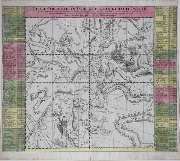 Carta celeste raffigurante le costellazioni zodiacali, rappresentate nella classica forma di animali mitologici. Si tratta della carta numero XXII dell’Atlas Coelestis ' (1742) di Johann Gabriel Doppelmaier che il professore di matematica all’Aegidien Gymnasium di Norimberga, rifacendosi in parte al lavoro di Pardies, redasse intorno al 1720 per conto dell’officina tipografica fondata nella stessa città nel 1702 dal cartografo Johann Baptist Homann. La mappa, la terza di sei che unitamente riproducono l’intera volta stellata, è quadrata di 43,4 centimetri di lato, rappresenta le costellazioni contenute nella fascia celeste intorno al solstizio invernale tra i 225° e i 315° di ascensione retta e i +45° e i -45° di declinazione. ' La proiezione gnomonica è concava, cioè geocentrica, e le stelle, suddivise in classi graduate di sei magnitudini, sono posizionate calcolando la precessione degli equinozi per l’anno 1730, ' ' vengono identificate da lettere dell’alfabeto latino, la successione ricomincia per ogni costellazione e corrisponde all’elenco ' ' posizionato a destra e sinistra della carta dove, per ogni stella, troviamo le coordinate in latitudine e longitudine, la magnitudine e la descrizione della posizione anatomica nel personaggio mitologico. Incisione in rame, coloritura coeva, in ottimo stato di conservazione. Celestial chart depicting the zodiacal constellations, represented in the classic form of mythological animals. This is map number 22 of the ' Atlas Coelestis ' (1742) by Johann Gabriel Doppelmaier that the professor of mathematics at the Aegidien Gymnasium in Nuremberg, referring in part to the work of Pardies, wrote around 1720 on behalf of the printing house founded in the same city in 1702 by cartographer Johann Baptist Homann. The map, the fifth of six that together reproduce the entire starry sky, is square with 43.4 cm side, represents the constellations contained in the celestial belt around the winter solstice between 225 ° and 315 ° of right ascension and +45 ° and -45 ° of declination. The gnomonic projection is concave, i.e. geocentric, and the stars, divided into graduated classes of six magnitudes, are positioned by calculating the precession of the equinoxes for the year 1730, are identified by letters of the Latin alphabet, the succession starts again for each constellation and corresponds to the list positioned to the right and left of the chart where, for each star, we find the coordinates in latitude and longitude, the magnitude and the description of the anatomical position in the mythological character. Copper engraving, contemporary coloring, in excellent condition. Cfr.