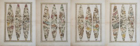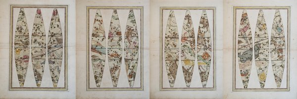 - EDIZIONE ORIGINALE, COLORITURA COEVA - Sei fogli destinati alla costruzione del globo celeste, due dei quali firmati da Giovanni Maria Cassini, furono pubblicati nel 1792 in Roma dalla Calcografia Camerale. Il globo celeste è basato sulle osservazioni astronomiche di Flamsteed e Lacaille, e rappresenta tutte le costellazioni allora conosciute con le stelle di grandezza variabile secondo la loro magnitudo. Le tavole riproducono i dodici spicchi di 30 gradi di A. R. d’ampiezza che, una volta ritagliati e incollati su di una sfera di legno e cartapesta del diametro di 35 cm, compongono l’intero globo celeste. Nel cartiglio posto al centro di uno degli spicchi, tra Boote e il Monte Menalo, si legge “GLOBO CELESTE Calcolato per il corrente anno sulle Osservazioni de’ Sigg. Flamsteed, e de la Caille. ROMA presso la Calc.a Cam.le 1792” . Quattro delle cinque tavole sono destinate a rappresentare le costellazioni, queste sono le stesse che troviamo nei due planisferi, nominate in lingua italiana dell’epoca , disegnate però di spalle in proiezione convessa , pronte per essere incollate su di una sfera di circa trentacinque centimetri di diametro. Le costellazioni non tolemaiche sono in numero notevole: Antinoo, la Chioma di Berenice, la Giraffa, il Liocorno, La Mosca, il Cuor di Carlo II, il Monte Menalo, la Renna, il Cerbero, l’Oca, la Volpe, i Levrieri, la Lince, il Leone minore, il Triangolo minore, la Lucerta, la Colomba, la Croce, con il termine la Nuvola le due nubi di Magellano, il Liocorno, il Sestante, lo Scudo di Sobieski, le dodici costellazioni di Bayer-Keyser-Houtman, le quattordici (quindici se gli si accredita la Musca) di Lacaille e il Solitarius di Le Monnier denominato in italiano il Passero Solitario. Il reticolo di riferimento è ridotto al minimo presentando soltanto i Circoli Polari, i Circoli dei Tropici, l’Eclittica, l’Equatore. Manca il reticolo per la lettura della Declinazione e dell’Ascensione Retta; l’Equatore e l’Eclittica riportano una scala graduata in tacche di un grado numerate progressivamente di dieci in dieci, la numerazione dell’Eclittica ricomincia da capo ogni 30 gradi per rispettare i confini delle costellazioni zodiacali. (cfr. F. Stoppa, ' Atlas Colestis) Giovanni Maria Cassini (1745 – 1824) fu un costruttore di globi, geografo, incisore e cartografo italiano. La sua opera principale fu il ' Nuovo Atlante Geografico Universale ' del 1792-1801. Nel 1790 la Calcografia Camerale di Roma pubblicò I suoi dodici fusi per globo terrestre, aggiornato secondo le ultime rilevazioni effettuate durante I tre viaggi attorno al mondo del Capitano inglese James Cook. Bellissimo esemplare della rara prima edizione, impresso su carta vergata coeva della fine del ‘700 e finemente colorato a mano in epoca, piccole ossidazioni, per il resto in eccellente stato di conservazione. Dei globi del Cassini esistono tirature sempre della Calcografia Camerale su carta meccanica ottocentesca (di colore bianco, senza vergelle, databili tra il 1820 e il 1870) e tirature con il timbro a secco della Calcografia Regia (post 1870). Bibliografia M. Fiorini (1899), Sfere terrestri e celesti, pp. 442/443; Schmidt R., Sfere del cielo sfere della terra, globi celesti e terrestri dal XVI al XX secolo (catalogo della mostra), p. 49, scheda VII.69; Dekker, p. 66; Dahl & Gauvin, Sphaerae Mundi early globes at the Stewart Museum, p.131-134. - FIRST EDITION, CONTEMPORARY OUTLINE COLOUR -Giovanni Maria Cassini (1745 – 1824) was an Italian globe maker, geographer, engraver and cartographer. His main cartographic work was the Nuovo Atlante Geografico Universale of 1792-1801. In 1790, the Calcografia Camerale of Rome published his twelve terrestrial globe gores that updated the world cartography after the three voyages of Captain James Cook around the globe.The twelve celestial globe gores were published in 1792. The celestial globe is based on the astronomical observations of Flamsteed and Lacaille, and represents all the constellations then known with stars of variable magnitude according to their magnitude. The plates reproduce the twelve segments of 30 degrees A. R. amplitude which, once cut out and glued onto a sphere of wood and papier-mâché with a diameter of 35 cm, make up the entire celestial globe. In the scroll at the center of one of the segments, between Boote and Mount Menalo, one reads "CELESTIAL GLOBE Calculated for the current year on the Observations of Messrs. Flamsteed and de la Caille. ROME at the Calc.a Cam.le 1792". Four of the five plates are intended to represent the constellations, these are the same that we find in the two planispheres, named in the Italian language of the time, but drawn from behind in convex projection, ready to be pasted on a sphere of about thirty-five centimeters in diameter. The non-Ptolemaic constellations are in considerable number: Antinoo, Berenice's Hair, the Giraffe, the Lyocorn, the Fly, the Heart of Charles II, Mount Menalo, the Reindeer, the Cerberus, the Goose, the Fox, the Greyhounds, the Lynx, the Lesser Lion, the Lesser Triangle, the Lucerta, the Dove, the Cross, with the term the Cloud the two clouds of Magellan, the Liocorn, the Sextant, the Shield of Sobieski, the twelve constellations of Bayer-Keyser-Houtman, the fourteen (fifteen if you credit the Musca) of Lacaille and the Solitarius of Le Monnier called in Italian the Lonely Sparrow. The reference grid is reduced to a minimum presenting only the Polar Circles, the Circles of the Tropics, the Ecliptic, the Equator. Lacking the grid for the reading of declination and right ascension, the Equator and the Ecliptic show a scale graduated in notches of one degree progressively numbered from ten to ten, the numbering of the Ecliptic starts over every 30 degrees to respect the boundaries of the zodiacal constellations. (see F. Stoppa, Atlas Colestis) Cassini was geographer and cartographer but he was also good at engraving architectural items and perspect