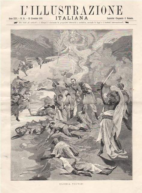 La scena allegorica rappresenta la caduta dei militari italiani in Africa. Testo al retro