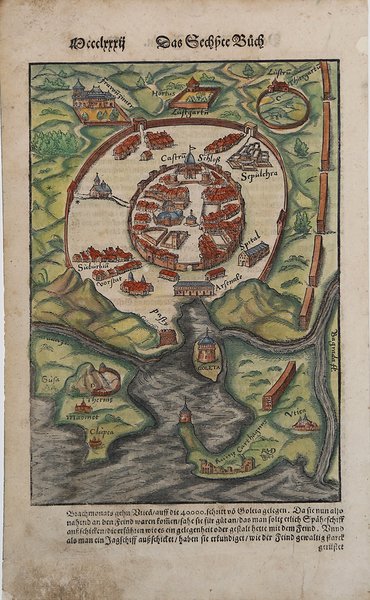 Tavola tratta dalla ' Cosmographiae Universalis, edizione in tedesco, Basilea, seconda metà del XVI secolo.La ' Cosmographiae Universalis ' di Sebastian Münster (1488-1552), stampata per la prima volta Basilea nel 1544 dall’editore Heinrich Petri, venne più volte aggiornata e aumentata di nuove carte geografiche e rappresentazioni urbane nelle sue numerose edizioni che arrivano all’inizio del secolo successivo. Münster aveva lavorato a raccogliere informazioni al fine di ottenere un'opera che non deludesse le aspettative e, dopo un'ulteriore pubblicazione in tedesco abbellita da 910 stampe su legno, giunse nel 1550 all'edizione definitiva in latino, illustrata da 970 silografie. Vi furono poi numerose edizioni in diverse lingue, fra cui latino, francese, italiano, inglese e ceco. Dopo la sua morte di Münster (1552), Heinrich Petri prima, e il figlio Sebastian poi, continuarono la pubblicazione dell’opera. La ' Cosmographia universalis ' fu uno dei libri più popolari e di successo del XVI secolo, e vide ben 24 edizioni in 100 anni: l'ultima edizione tedesca venne pubblicata nel 1628, molto tempo dopo la morte dell'autore. La ' Cosmographia ' conteneva non solo le ultime mappe e vedute di tutte le città più famose, ma anche una serie di notizie enciclopediche di dettagli relative al mondo conosciuto, e sconosciuto. Il particolare successo anche commerciale di quest'opera fu dovuto in parte alle belle incisioni (tra i cui autori si possono citate Hans Holbein il Giovane, Urs Graf, Hans Rudolph Manuel Deutsch, David Kandel). Silografia, bella coloritura a mano, in buone condizioni. Plate taken from the ' Cosmographiae Universalis, German edition, Basel, second half of the 16th Century. The ' Cosmographiae Universalis ' of Sebastian Münster (1488-1552), printed for the first time in Basel in 1544 by the publisher Heinrich Petri, was updated several times and increased with new maps and urban representations in its many editions until the beginning of the next century. Münster had worked to collect information in order to obtain a work that did not disappoint expectations and, after a further publication in German embellished with 910 woodblock prints, arrived in 1550 to the final edition in Latin, illustrated by 970 woodcuts. There were then numerous editions in different languages, including Latin, French, Italian, English and Czech. After his death in Münster (1552), Heinrich Petri first, and then his son Sebastian, continued the publication of the work. The ' Cosmographia universalis ' was one of the most popular and successful books of the 16th century, and saw as many as 24 editions in 100 years: the last German edition was published in 1628, long after the author's death. The ' Cosmographia ' contained not only the latest maps and views of all the most famous cities, but also a series of encyclopedic details related to the known, and unknown, world. The particular commercial success of this work was due in part to the beautiful engravings (among whose authors can be mentioned Hans Holbein the Younger, Urs Graf, Hans Rudolph Manuel Deutsch, David Kandel). Woodcut, beautiful hand-coloring, in good condition. Cfr.