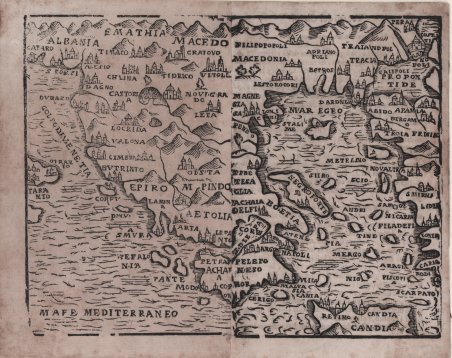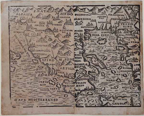 Carta geografica tratta dal celebre "Teatro del cielo e della terra. Di Gioseppe Rosaccio nel quale si discorre breuemente. Del centro, e doue sia del terremoto, e sue cause. De' fiumi, e loro proprietà, de' metalli, e loro origine, del mondo, e le sue parti. Dell'acqua, e sua salsedine" edito a Venezia per la prima volta nel 1595. La carta è caratterizzata dal fatto di essere stampata da due matrici lignee, e quindi poi unita. La matrice viene usata per illustrare altre due opere del Rosaccio, il "Le sei età del Mondo" e il "Mondo e sue parti", editi tra Treviso, Bologna, Firenze, Verona, Venezia e Viterbo tra il 1594 e il 1668. Solo l'ultima edizione, quella di Bologna del 1688, ha le tavole realizzate ex novo, in una sola matrice. Xilografia, applicata su antico supporto, in ottimo stato di conservazione. Non comune. Charming wood block map of by the Italian XVIth and XVIIth century writer, humanist and cartographer Giuseppe Rosaccio. Taken from one of the editions of "Teatro del cielo e della terra" and also insert in "Le sei età del Mondo" or "Il Mondo e sue parti", works by Rosaccio himself. The book was very popular and many edition where printed in Treviso, Bologna, Florence, Verona, Venice, Viterbo from 1594 and 1688. The maps are printed from two wood block except the last edition of 1688. Woodcut, laid down on antique mounting, in very good conditions. Cfr.
