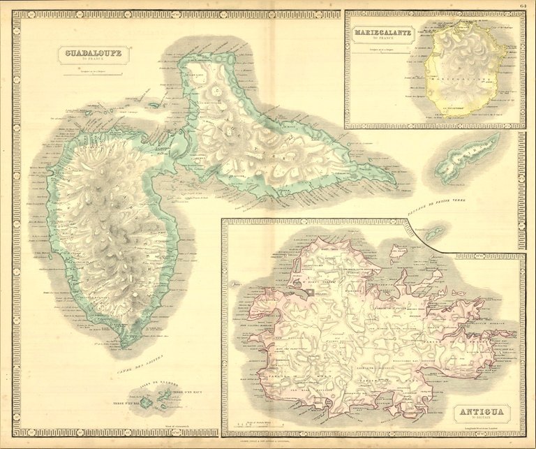 Carta geografica raffigurante le isole francesi di Guadaloupe, Mariegalante e la britannica Antigua. Piccoli fori di tarlo che non compromettono l'ottimo stato di conservazione generale. Attraente coloritura coeva all'acquerello.