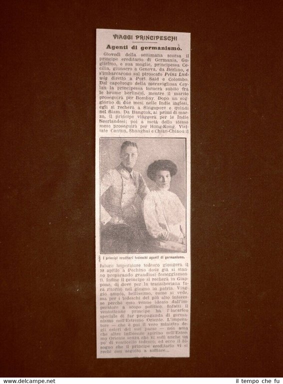 Rara stampa estratta da pubblicazione del 1910. .stampa che ha quindi oltre 109 anni! Guglielmo di Prussia e Cecilia di Meclemburgo-Schwerin nel 1910 Visita a Genova II1910-065 Dimensioni Cm 6,00 x 21,00 Qualora vogliate delle scansioni migliori contattateci, soddisferemo ogni vostra richiesta. Paypal Carta di credito Bonifico bancario Spedizione con posta ordinaria o raccomandata scelta dall'acquirente nel momento del pagamento