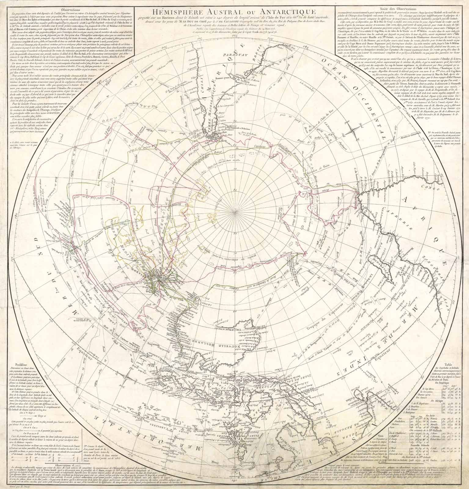 Importante carta geografica dell'Emisfero Australe realizzata per la prima volta da Robert De Vaugondy per esser presentata all'Académie des sciences de Paris il 24 marzo del 1773. Il presente esemplare è il terzo stato di tre e riporta significativi aggiornamenti basati su osservazioni astronomiche rispetto al secondo stato del 1776, con indicazione delle recenti spedizioni di Cook e Bouganville in Nuova Zelanda, Australia e parte meridionale del Pacifico.In alto, al centro, il titolo. Sulla sinistra riquadro dedicato alle "Observations", mentre sulla destra "Suite des Observations". In basso a destra "Table" con indicazione delle longitudini e latitudini osservate astronomicamente riferite al primo meridiano fissato nell'Isola del Ferro a 20° ovest del meridiano di Parigi. In calce le "Obeservations du 1777": "Le dernier et admirable voyage que vient de faire M . Cook achève de completter la conaissance de l'Hémisphère Austral.".Nella carta si trovano tracciati anche i viaggi di Tasman (1642), Halley (1700), St. Louis (1718), Bouvet (1738) e come precedentemente accennato quelli intrapresi da Cook e Bougainville.In particolare i viaggi di Cook sono evidenziati in coloritura coeva all'acquerello. La "Nouvelle Guinee" si presenta ancora non del tutto definita e questo vale anche l'Australia "Nouvelle Hollande" in cui manca porzione della Carpentaria, la costa orientale è ancora frastagliata, la Tasmania sembra ancora un prolungamento della costa orientale e non identificata come isola e porzione della parte meridionale ancora da scoprire e rappresentare. L'incisione presenta alcuni restauri professionalmente eseguiti. Si segnala in particolare una piccola perdita di testo nell'angolo in basso a destra. Complessivamente da considerarsi un buon esemplare di questa rara carta pubblicata come foglio singolo.