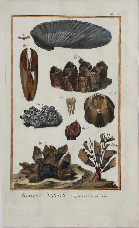 Tavola tratta da ' Histoire Naturelle, Coquilles Fossiles, appendice di ' Encyclopédie ou Dictionnaire raisonné des sciences, des arts et des métiers, di Diderot e D’Alambert. L’opera è una vasta enciclopedia, ' pubblicata nel XVIII secolo, in lingua francese, da un consistente gruppo di intellettuali sotto la direzione di Diderot e D'Alembert. Essa rappresenta un importante punto di arrivo di un lungo percorso teso a creare un compendio universale del sapere, nonché il primo prototipo di larga diffusione e successo delle moderne enciclopedie, al quale guarderanno e si ispireranno nella struttura quelle successive. Incisione in rame, finemente colorata a mano, in ottimo stato di conservazione. Copper engraving, finely colored by hand, in excellent condition. Taken from ' Histoire Naturelle, Coquilles Fossiles, appendix of ' Encyclopédie ou Dictionnaire raisonné des sciences, des arts et des métiers, by Diderot and D'Alambert. ' This work is a great encyclopedia, ' published in the XVIII century, in French, by a large group of intellectuals under the direction of Diderot and D'Alembert. Cfr.
