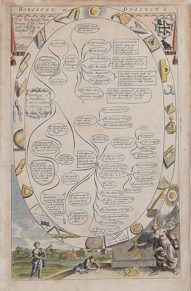 Illustrazione tratta dall'opera "The Gentlemans Recreation in Three Parts", di Richard Blome, pubblicata per la prima volta a Londra nel 1686. Le numerose iscrizioni descrivono l'arte e la tecnica dell'orologeria; in basso, due figure e un angelo con compassi, quadranti e altri strumenti di misura. Incisione in rame, colorata a mano, in buone condizioni. Taken from 'The Gentlemans Recreation in Three Parts' by Richard Blome, London: S. Roycroft, 1686. Large oval with inscriptions explaining the various parts of the art of horology; below, two figures and an angel with compasses, quadrant, and other measuring instruments. Copper engraving, hand-coloured, in very good conditions. Cfr.