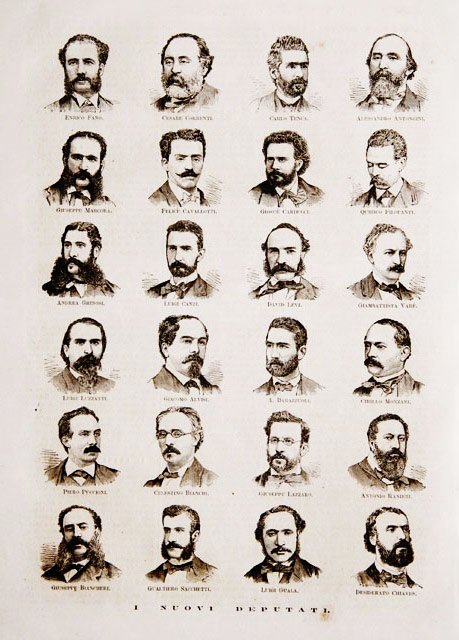Ritratti di deputati in unico foglio: Enrico Fano, Cesare Correnti, Carlo Tenca, Alessandro Antongini, Giuseppe Marcora, Felice Cavallotti, Giosué Carducci, Quirico Filopanti, Andrea Ghinosi, Luigi Canzi, David Levi, Giambattista Varè, Luigi Luzzati, Giacomo Alvisi, A. Barazzuoli, Cirillo Monzani, Piero Puccioni, Celestino Bianchi, Giuseppe Lazzaro, Antonio Ranieri, Giuseppe Biancheri, Gualtiero Sacchetti, Luigi Guala, Desiderato Chiaves.Testo al retro