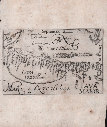 Rarissima carta di Giava pubblicata nella prima edizione della traduzione tedesca di Hieronymus Megiser del famoso resoconto di viaggio di Ludovico di Varthema in Arabia, Siria, Persia, Etiopia, India e Indie Orientali. "Varthema's Itinerario, first published in 1510, had an enormous impact at the time, and in some respects determined the course of European expansion towards the Orient" (Howgego). L'edizione del 1510, pubblicata in italiano a Roma, non aveva illustrazioni. Mappa tratta da Hodaeporicon Indiae Orientalis; Das ist: Warhafftige Beschreibung der ansehnlich lobwürdigen Reyß, welche der edel, gestreng und weiterfahrne Ritter, H. Ludwig di Barthema von Bononien aus Italia bürtig, in die Orientalische und Morgenländer, Syrien, beide Arabien, Persien und Indien, auch in Egypten und Ethyopien, zu Land und Wasser persönlich verrichtet [.] stampato a Lipsia Henning Groß, 1608. Ludovico di Varthema o Barthema (ca. 1468-1517) salpò da Venezia per l'Egitto nel 1502 e viaggiò attraverso Alessandria, Beirut, Tripoli e Aleppo, arrivando a Damasco nell'aprile del 1503. Qui si arruolò nella guarnigione mamelucca e proseguì via terra verso Khaybar, Medina e La Mecca, diventando così il primo europeo a entrare nelle due città più sacre dell'Islam. I suoi viaggi lo portarono anche in Arabia del Sud, in Persia, in India, a Goa, a Cochin e, presumibilmente, nell'istmo malese, a Sumatra, a Banda, nelle Molucche, nelle Isole delle Spezie, nel Borneo, a Giava e a Malacca. È stato spesso suggerito, tuttavia, che egli non si sia mai spinto più a est di Ceylon e che il resoconto del resto del suo viaggio sia stato assemblato da storie tramandate da altri, ma anche in queste regioni molte delle sue informazioni sembrano essere accurate. Grazie alla sua conoscenza dell'arabo e dell'Islam, Varthema fu in grado di apprezzare la cultura locale dei luoghi che visitò. Colpito e affascinato, descrive non solo riti e rituali, ma anche aspetti sociali e geografici e dettagli della vita quotidiana. Descrive in modo dettagliato La Mecca e il pellegrinaggio islamico, e la sua descrizione dell'Hejaz (la costa occidentale dell'Arabia sul Mar Rosso, che comprende La Mecca e Medina) è particolarmente preziosa perché precedente all'occupazione ottomana del 1520. Tornò infine a Lisbona nel 1508. Il resoconto di Varthema divenne un bestseller non appena apparve nel 1510 e passò attraverso una ventina di edizioni in varie lingue nei successivi cinquant'anni. Sicuramente ha fornito a molti europei il primo sguardo sulla cultura islamica e sulle culture extraeuropee in generale. Riferimenti Howgego, to 1800, V15 (solo altre edizioni); D. F. Lach, Asia in the making of Europe I, pp. 164-166, 503, 593-594. A very rare map of Java published in the first edition of Hieronymus Megiser's German translation: Ludovico di Varthema's famous account of travels to Arabia, Syria, Persia, Ethiopia, India and the East Indies; a highly important and adventurous narrative including the first printed eyewitness account of any place in today's United Arab Emirates. "Varthema's Itinerario, first published in 1510, had an enormous impact at the time, and in some respects determined the course of European expansion towards the Orient" (Howgego). The 1510 edition, published in Italian at Rome, had no illustrations. Map taken from Varthema, Lodovico di. ' Hodaeporicon Indiae Orientalis; Das ist: Warhafftige Beschreibung der ansehnlich lobwürdigen Reyß, welche der edel, gestreng und weiterfahrne Ritter, H. Ludwig di Barthema von Bononien aus Italia bürtig, in die Orientalische und Morgenländer, Syrien, beide Arabien, Persien und Indien, auch in Egypten und Ethyopien, zu Land und Wasser persönlich verrichtet [.], Leipzig, Henning Groß, 1608. Ludovico di Varthema or Barthema (ca. 1468-1517) sailed from Venice to Egypt in 1502 and travelled through Alexandria, Beirut, Tripoli and Aleppo, arriving in Damascus in April 1503. There he enrolled in the Mameluke garrison and proceeded overland to Khaybar, Medina and Mecca, thereby becoming the first European to enter the two holiest cities of Islam. His travels took him further to South Arabia, Persia, India, Goa, Cochin, and supposedly the Malay isthmus, Sumatra, Banda, the Moluccas, the Spice Islands, Borneo, Java and Malacca. It has often been suggested, however, that he never came further east than Ceylon and that the account of the rest of his journey was assembled from stories passed on by others, but even in these regions much of his information appears to be accurate. Thanks to his knowledge of Arabic and of Islam, Varthema was able to appreciate the local culture of the places he visited. Impressed and fascinated, he describes not only rites and rituals, but also social and geographical aspects and details of daily life. He gives a detailed description of Mecca and the Islamic pilgrimage, and his description of the Hejaz (the west coast of Arabia on the Red Sea, including Mecca and Medina) is especially valuable as it pre-dates the Ottoman occupation of 1520. He finally returned to Lisbon in 1508. Varthema's account became a bestseller as soon as it appeared in 1510 and went through about twenty editions in various languages in the next fifty years. It certainly provided many Europeans with their first glimpse of Islamic culture and of non-European cultures in general. References Howgego, to 1800, V15 (other eds. only); D. F. Lach, Asia in the making of Europe I, pp. 164-166, 503, 593-594. Cfr.