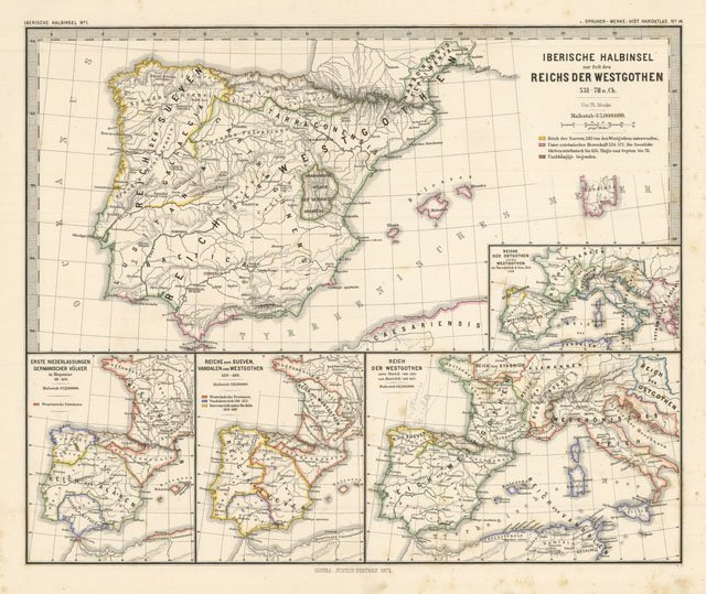 Carta geografica della Penisola Iberica in diversi riquadri, raffiguranti i regni Visigoti e Ostrogoti