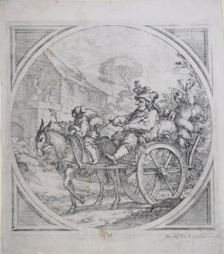 Acquaforte, 1750 circa, firmata in basso a destra ‘Joan. Aug. Ratti Pictor Sanueasis inv. et fec.’Bellissima prova, impressa su carta vergata coeva, una piccola macchia nel bordo bianco inferiore, qualche piega di carta, nel complesso in ottimo stato di conservazione. Questa rara incisione del celebre pittore ligure Giovanni Augusto Ratti fa da pendant con un altro foglio che rappresenta Pulcinella infelice che abbandona la casa con la propria famiglia.Il tema di Pulcinella era stato rappresentato da Ratti non solo in queste due incisioni ma anche, in qualità di pittore ceramista, su maiolica.Il savonese Giovanni Agostino Ratti (Savona, 1699 - Genova, 1775) nella sua carriera di pittore ha prodotto numerosi quadri di soggetto sacro e profano che ornano chiese, oratori e palazzi di tutta la Liguria, dove principalmente operò nella sua vita. Fu padre e maestro di Carlo Giuseppe Ratti e frequentò a Roma la scuola di Benedetto Luti. Protagonista della pittura a Savona nel Settecento, il Ratti a metà del secolo rappresenta anche nel più vasto panorama culturale ligure un riferimento di spicco, soprattutto per l'impegno nella costituzione e nell'incremento - anche attraverso gli influssi sul figlio Carlo Giuseppe - dell'Accademia Ligustica di Belle Arti.Sono note 22 incisioni, quasi tutte realizzate durante il suo soggiorno romano. Le due incisioni di Pulcinella, però, furono realizzate una volta rientrato in Liguria, dove continuò a lavorare tra Savona e Genova, fino alla sua morte. Etching, 1750 circa, signed on platea t lower right ‘Joan. Aug. Ratti Pictor Sanueasis inv. et fec.’Good example, printed on contemporary laid paper, below small spot in the white border, otherwise in good condition.A very rare etching by the famous Italian painter Giovanni Augusto Ratti is a pair with another sheet showing Pulcinella, sad, who leaves the house with his family.The theme of Pulcinella was represented by Ratti not only in these two recordings but also, as a ceramist, on majolica.Giovanni Agostino Ratti, from Savona, came early to Rome, where he studied for several years in the studio of Benedetto Luti. Most of his 22 well-known etchings originated mainly in Rome, but the motifs of the Pulcinella did not arise until after his return to the homeland, where he pursued various orders between Savona and Genoa until his death. Cfr. De Vesme 20