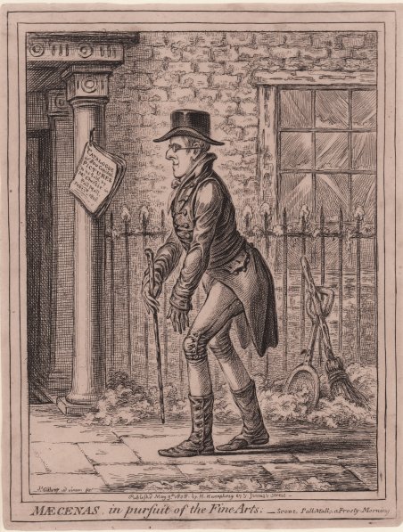 Acquaforte, 1808, firmata in lastra in basso a sinistra. Edita da H. Humphreys a Londra.Bellissima prova, impressa su carta coeva, rifilata al rame, in ottimo stato di conservazione.L'opera raffigura, nello stile satirico tipico del Gillray, il ritratto di George Granville (1758–1833), secondo Duca di Stafford, all'ingresso della casa d'aste Christie's nel 1808. Etching, 1808, signed at lower left. A fine impression, printed on wove paper, trimmed to the platemark, very good condition. Published by H. Humphreys, London.This print is the satirical portrait of George Granville (1758–1833), the 2nd Marquis of Stafford walking into Christie's Auction House. Cfr. Wright & Evans 560; British Museum Satires VIII.11076; Grego, p. 360; reprint G.W.G. (1830) II.66; Godfrey, Gillray 180B