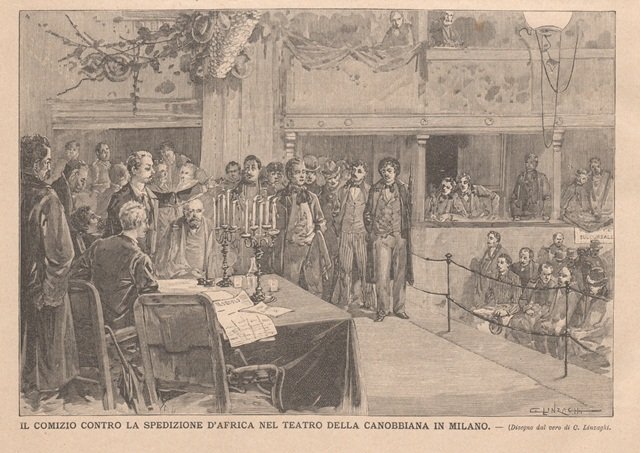 Il comizio contro la spedizione d’Africa nel teatro della Canobbiana in Milano