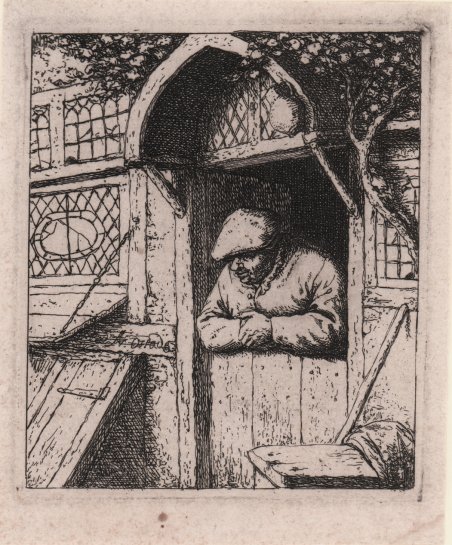 Acquaforte, 1653 circa, firmata in lastra in mezzo a sinistra.Esempalre nel quarto stato di quattro descritto da Godefroy.Bellissima prova, impressa su carta vergata coeva, con margini, in perfetto stato di conservazione. Adriaen van Ostade, o Adriaen Hendricx (10 dicembre 1610 – 2 maggio 1685), è stato un pittore e incisore olandese. Era il figlio più grande di Jan Hendricx Ostade e fratello maggiore di Isaak van Ostade. Secondo Jacobus Houbraken, dal 1627 van Ostade fu allievo di Frans Hals, al tempo maestro anche di Adriaen Brouwer e Jan Miense Molenaer. Pittore di scene di genere, prediligeva le figure di contadini, interni rustici e avventori di taverne. ' Apprezzato anche per i disegni acquerellati e le incisioni, eseguì dipinti di genere spesso di piccolo formato con effetti di luce quasi rembrandtiani, in cui appaiono figure argute e lievemente caricaturali. Ostade fu contemporaneo dei pittori fiamminghi David Teniers il Giovane e Adriaen Brouwer. Come loro, si dedicò alla delineazione della vita ordinaria, raffigurando scene di taverna, fiere di paese e quartieri di campagna. Tra Teniers e Ostade il contrasto sta nella diversa condizione delle classi agricole del Brabante e dell'Olanda e nell'atmosfera e nelle abitazioni proprie di ciascuna regione. Il Brabante ha più sole e più comodità; Teniers, di conseguenza, è argentea e scintillante, e le persone che dipinge sono esemplari di cultura. L'Olanda, nelle vicinanze di Haarlem, sembra aver sofferto molto a causa della guerra; l'aria è umida e nebulosa, e le persone ritratte da Ostade sono basse e sfortunate, segnate dall'impronta delle avversità nei tratti e nell'abbigliamento. La grandezza di Ostade sta nel fatto che spesso ha colto il lato poetico della classe contadina nonostante la sua rozzezza. Ha dato la luce magica di un raggio di sole ai loro sport umili, ai loro litigi, persino ai loro più tranquilli stati d'animo di divertimento; ha rivestito i ruderi dei cottage con una vegetazione colorata. Etching, circa 1653, signed at left center.Exampel of the fourth state of four, according by Godefroy.A fine impression, printed on contemporary laid paper, with margins, very good conditions. Adriaen van Ostade, or Adriaen Hendricx (December 10, 1610 - May 2, 1685), was a Dutch painter and engraver. He was the oldest son of Jan Hendricx Ostade and older brother of Isaak van Ostade. According to Jacobus Houbraken, from 1627 van Ostade was a pupil of Frans Hals, at the time also a master of Adriaen Brouwer and Jan Miense Molenaer. A painter of genre scenes, he favored figures of peasants, rustic interiors and tavern patrons. ' Also appreciated for his watercolor drawings and etchings, he executed often small-scale genre paintings with almost Rembrandtian lighting effects, in which witty and slightly caricatured figures appear. Ostade was a contemporary of Flemish painters David Teniers the Younger and Adriaen Brouwer. Like them, he devoted himself to the delineation of ordinary life, depicting tavern scenes, village fairs, and country quarters. Between Teniers and Ostade the contrast lies in the different condition of the agricultural classes in Brabant and Holland and in the atmosphere and dwellings peculiar to each region. Brabant has more sunshine and comfort; Teniers, consequently, is silvery and glittering, and the people it paints are exemplars of culture. Holland, in the vicinity of Haarlem, seems to have suffered greatly from the war; the air is humid and hazy, and the people portrayed by Ostade are short and unfortunate, marked by the imprint of adversity in their features and clothing. Ostade's greatness lies in the fact that he often captured the poetic side of the peasant class despite its roughness. He gave the magical light of a ray of sunshine to their humble sports, their quarrels, even their quieter moods of amusement; he clothed cottage ruins with colorful vegetation. Cfr. Hollstein 9.III; Bartsch I.354.9; Godefroy 9, IV/IV.
