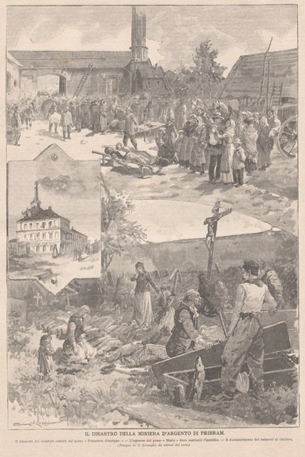 Tre immagini descrivono il disastro dopo l’esplosione della miniera d’argento di Pribram in Boemia. Testo al retro