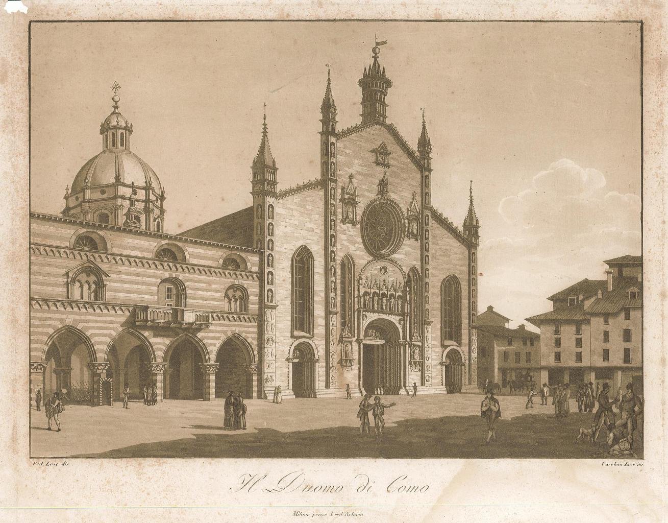 Stampa, antica ed originale, del Duomo di Como con piazza molto animata da personaggi, stampata con inchiostro bruno. Autore: Lose F. dis. & Lose C. inc. Luogo: Lago di Como - Como. Anno: 1815-1821. Tecnica: acquatinta. Dimensioni: 199x278 mm