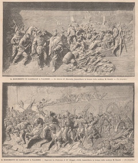 Due immagini in unico foglio: Lo sbarco di Marsala, bassorilievo in bronzo dello scultore M. Rutelli - Ingresso in Palermo il 27 maggio 1860, bassorilievo in bronzo dello scultore M. Rutelli. Testo al retro