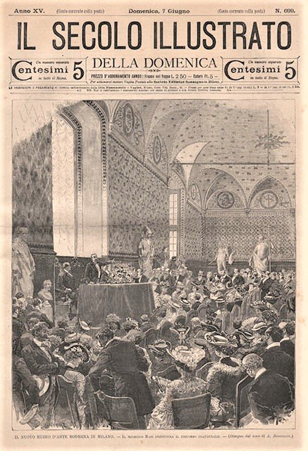 Veduta dei discorsi inaugurali al Castello Sforzesco di Milano del nuovo museo. Testo al retro