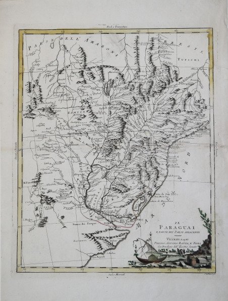 Carta geografica tratta dall’Atlante novissimo, illustrato ed accresciuto sulle osservazioni e scoperte fatte dai più celebri e più recenti geografi. Stampato in quattro volumi da Antonio Zatta tra il 1779 ed il 1785. Atlante fra i più belli e completi mai pubblicati in Italia nel XVIII secolo, l'opera più famosa dello Zatta. L’Atlante Novissimo, come si specifica anche nel titolo, è “accresciuto sulle osservazioni scoperte fatte dai più celebri e più recenti geografi”. Tra le novità più significative vi è la comparsa delle nuove isole scoperte nell'Oceano Pacifico da James Cook e la prima carta italiana della Nuova Zelanda. Le illustrazioni furono ' ideate e disegnate dai suoi collaboratori Giovanni Marco Pitteri, Anton Friedrich Busching, Pietro Antonio Novelli ed incise da Giuliano Zuliani. Il primo tomo dell’atlante è introdotto da un breve saggio di geografia generale dove l’autore definisce in modo sintetico e preciso gli elementi che compongono i reticoli eclittico ed equatoriale usati nelle tavole. Interessante la sezione dove si sofferma ' a descrivere il fenomeno della precessione degli equinozi e quello della variazione ciclica dell'obliquità dell'eclittica. Acquaforte, stampata su carta vergata coeva, coloritura coeva dei contorni, in buone condizioni. ' A lovely map that covers Uruguay, Paraguay, and parts of Brazil and Argentina including the region from the Rio de la Plata and Buenos Ayres up the coast to Rio de Janeiro and west to the Andes. Filled with information including rivers, mountains, coastal detail, and numerous place names. The decorative title cartouche features a local sail boat. Map from the Atlante novissimo, illustrato ed accresciuto sulle osservazioni e scoperte fatte dai più celebri e più recenti geografi. Printed in four volumes by Antonio Zatta between 1779 and 1785. ' Atlas among the most beautiful and complete ever published in Italy in the eighteenth century, the most famous work of Zatta. The Atlante Novissimo, as also specified in the title, is “increased on the observations made by the most famous and most recent geographers”. Among the most significant innovations there is the appearance of the new islands discovered in the Pacific Ocean by James Cook and the first Italian map of New Zealand. The illustrations were designed and drawn by his collaborators Giovanni Marco Pitteri, Anton Friedrich Busching, Pietro Antonio Novelli and engraved by Giuliano Zuliani. The first volume of the atlas is introduced by a brief essay of general geography where the author defines in a concise and precise way the elements that make up the ecliptic and equatorial grids used in the tables. Interesting is the section where he pauses to describe the phenomenon of precession of the equinoxes and the cyclical variation of the obliquity of the ecliptic. Etching, printed on contemporary laid paper, contemporary outline coloring, in good condition. Cfr.