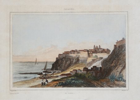Veduta tratta da L'Italie pittoresque [.]. Gravures sur acier d'après les dessins de madame D'Haubecourt-Lescot, de Mm. le Comte de Forbin, Granet, Deveria… edita a Parigi dal 1834 al 1836. Bella guida sull'Italia, pubblicata per la prima volta nel 1834, composta dai racconti di personaggi come Norvins, Nodier, Dumas, Berlioz (autore del capitolo Voyage musicale) e altri con le belle incisioni in acciaio da disegni di madame D'Haubecourt-Lescot, del conte de Forbin, Granet, Deveria ecc. Incisione in rame, finemente colorata a mano, in ottimo stato di conservazione. View taken from L'Italie pittoresque [.]. Gravures sur acier d'après les dessins de madame D'Haubecourt-Lescot, de Mm. le Comte de Forbin, Granet, Deveria. published in Paris from 1834 to 1836. A beautiful guide to Italy, first published in 1834, consisting of the accounts of such personalities as Norvins, Nodier, Dumas, Berlioz (author of the chapter entitled Voyage musicale) and others with beautiful steel engravings from drawings by Madame D'Haubecourt-Lescot, the Comte de Forbin, Granet, Deveria, etc. ' Copperplate, finely hand-coloured, in excellent condition. Cfr.