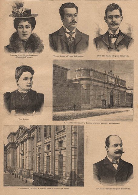 Veduta del carcere e del palazzo di Giustizia di Torino e cinque ritratti di protagonisti del processo: Linda Murri-Bonmartini, Tullio Murri, Riccardo Murri, Pio Naldi, Tisa Borghi e Carlo Secchi. Testo al retro