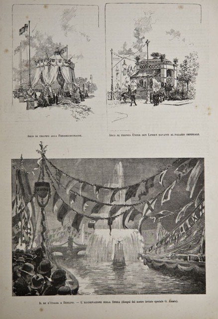 Il re d’Italia a Berlino / Arco di trionfo alla Friedrichstrasse / Arco di trionfo Unter den Linden davanti al palazzo imperiale / L’illuminazione sulla Sprea