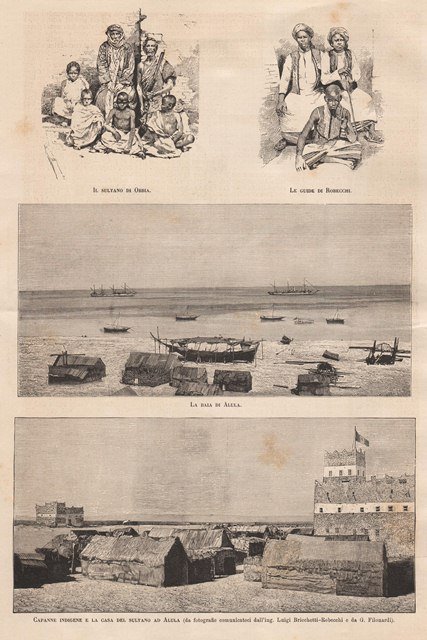 Il sultano di Obbia - Le guide di Robecchi - La baia di Alula - Capanne indigene e la casa del sultano ad Alula