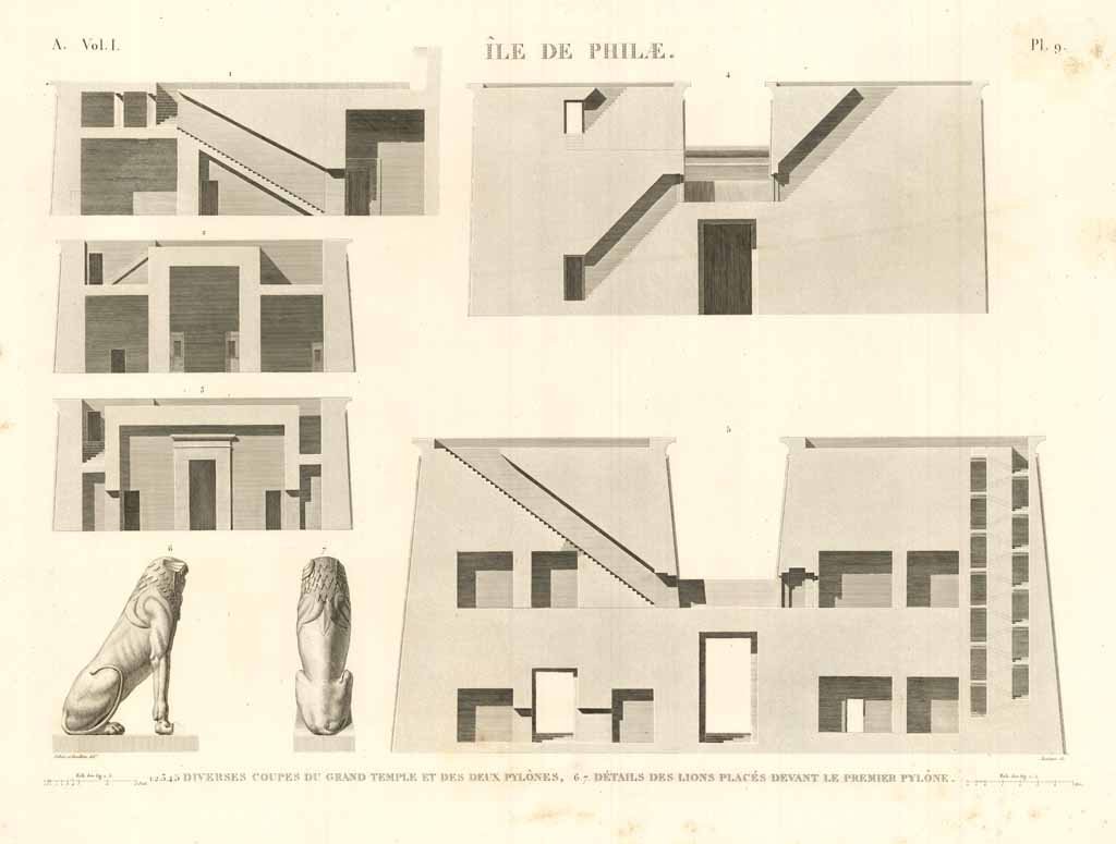 Sezioni del Tempio di Iside e dei due piloni. In basso a sx due vedute dei leoni posti all’ingresso del primo pilone. Incisione all’acquaforte su lastra di rame, inserita nella monumentale opera Description de l’Egypte, II° edizione dal 1820-29 voluta da Luigi XVIII, importante risultato culturale dell’occupazione francese in Egitto per il periodo che va dal 1798 al 1801. Bonaparte decise di invadere queste terre per controllare le vie commerciali verso l’india ed assestare in questo modo un duro colpo all’economia britannica. Durante questa operazione, il Nostro favorì l’attività di numerosi artisti, ingegneri, matematici e naturalisti per registrare e catalogare con estrema precisione le costruzioni e i monumenti egiziani nonché la flora e la fauna. Il risultato di questo immane sforzo, che per la pubblicazione coinvolse quasi duemila tra artisti e tecnici oltre a quattrocento incisori, fu l’opera "Description de l’Egypte, ou recueil des observations et des recherches qui ont été faites en Egypte pendant l’expédition de l’armée française", che offre una globale visione scientifica dell’antico e moderno Egitto, nonché la sua storia naturale. La Description ebbe grande influenza sul movimento orientalista pittorico dell’ottocento e diede un contributo fondamentale alla diffusione dell’Egittologia. Numerosi edifici rappresentati in queste tavole sono stati completamente distrutti nel tempo.