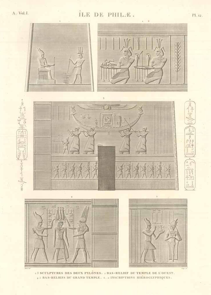 Rappresentazioni di bassorilievi del Tempio di Philae dedicati alla dea Iside, dea della fertilità e della nascita, che raffigurano scene di offerte alle divinità. Incisione all’acquaforte su lastra di rame, inserita nella monumentale opera Description de l’Egypte, II° edizione dal 1820-29 voluta da Luigi XVIII, importante risultato culturale dell’occupazione francese in Egitto per il periodo che va dal 1798 al 1801. Bonaparte decise di invadere queste terre per controllare le vie commerciali verso l’india ed assestare in questo modo un duro colpo all’economia britannica. Durante questa operazione, il Nostro favorì l’attività di numerosi artisti, ingegneri, matematici e naturalisti per registrare e catalogare con estrema precisione le costruzioni e i monumenti egiziani nonché la flora e la fauna. Il risultato di questo immane sforzo, che per la pubblicazione coinvolse quasi duemila tra artisti e tecnici oltre a quattrocento incisori, fu l’opera "Description de l’Egypte, ou recueil des observations et des recherches qui ont été faites en Egypte pendant l’expédition de l’armée française", che offre una globale visione scientifica dell’antico e moderno Egitto, nonché la sua storia naturale. La Description ebbe grande influenza sul movimento orientalista pittorico dell’ottocento e diede un contributo fondamentale alla diffusione dell’Egittologia. Numerosi edifici rappresentati in queste tavole sono stati completamente distrutti nel tempo.