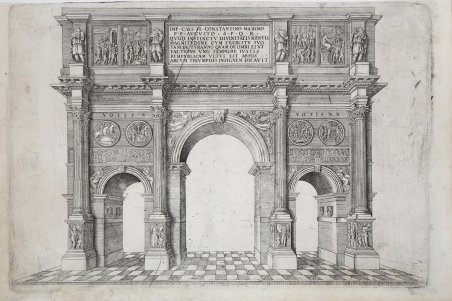 Bulino, 1550/60 circa, privo di data e firma. Copia anonima dell’incisione stampata da Antonio Lafreri, descritta da Silvia Bianchi (D31, copia B). SI distingue poiché le righe dell’iscrizione hanno lunghezza diseguale. Bellissima prova, impressa su carta vergata coeva con filigrana "scala in uno scudo con stella" (Woodward nn. 243-254), con margini, tracce di piega di carta obliqua nella parte superiore destra, per il resto in ottimo stato di conservazione. Molto rara. Iscrizione in alto al centro: "IMP. CAES. FL. CONSTANTINO. MAXIMO. / P. F. AVGVSTO. S. P. Q. R. / QVOD INSTINCTV DIVINITATIS MENTIS / MAGNITVDINE CVM EXERCITV SVO / TAM DE TYRANNO QVAM DE OMNI EIVS / FACTIONE VNO TEMPORE IVSTIS / REMPVBLICAM VLTVS EST ARMIS / ARCVM TRIVMPHIS INSIGNEM DICAVIT". L’arco fu eretto fra il 312 e il 315 per celebrare la vittoria di Costantino su Massenzio nella decisiva battaglia di ponte Milvio. È da ricordare che la costruzione di un arco onorario, come monumento ufficiale per conferire gli onori alla persona del Princeps o dei membri della sua domus, era esclusiva competenza del Senato romano. Sebastiano Serlio, contemporaneo degli incisori della bottega del Lafréry, così descrive l’arco e le sue reali condizioni nel Cinquecento: «Appresso l’amphitheatro di Roma detto dal uulgo il Coliseo è un bellissimo arco molto ricco di ornamenti, e di statue, e d’historie diuerse, e fu dedicato a Constantino, e uulgarmente si chiama l’arco di Trasi. Questo bell’arco, ancora che al presente sia sepolto in gran parte per le ruine, & accrescimento di terreno; nientedimanco egli è di grande altezza, & i suoi transiti trapassano l’altezza di due quadri, e massimamente quei dalle bande. Quest’arco è bellissimo all’occhio, e molto ricco di ornamenti e d’intagli: bene è il uero che li corniciamenti non sono di molto bella maniera, quantunque siano ricchi d’intagli […]. Fu misurato col palmo antico Romano, cioè a palmo & a minuti». Ovviamente la rappresentazione grafica riflette le misurazioni dell’epoca: «Nonostante la differenza di modi, anche Serlio, come Lafréry, non fornisce rilievi esatti, in questo caso gli archi antichi, nonostante che nel testo ad accompagnare le figure vi siano misurazioni in apparenza certe» (cfr. Marigliani, ' Lo splendore di Roma nell’Arte incisoria del Cinquecento). L’opera appartiene allo ' Speculum Romanae Magnificentiae, la prima iconografia della Roma antica. ' Lo ' Speculum ' ebbe origine nelle attività editoriali di Antonio Salamanca e Antonio Lafreri (Lafrery). Durante la loro carriera editoriale romana, i due editori - che hanno lavorato insieme tra il 1553 e il 1563 - hanno avviato la produzione di stampe di architettura, statuaria e vedutistica della città legate alla Roma antica e moderna. Le stampe potevano essere acquistate individualmente da turisti e collezionisti, ma venivano anche acquistate in gruppi più grandi che erano spesso legati insieme in un album. Nel 1573, Lafreri commissionò a questo scopo un frontespizio, dove compare per la prima volta il titolo Speculum Romanae Magnificentiae. Alla morte di Lafreri, due terzi delle lastre di rame esistenti andarono alla famiglia Duchetti (Claudio e Stefano), mentre un altro terzo fu distribuito tra diversi editori. Claudio Duchetti continuò l’attività editoriale, implementando le lastre dello Speculum con copie di quelle “perdute” nella divisione ereditaria, che fece incidere al milanese Amborgio Brambilla. Alla morte di Claudio (1585) le lastre furono cedute – dopo un breve periodo di pubblicazione degli eredi, in particolare nella figura di Giacomo Gherardi - a Giovanni Orlandi, che nel 1614 vendette la sua tipografia al fiammingo Hendrick van Schoel. Stefano Duchetti, al contrario, cedette le proprie matrici all’editore Paolo Graziani, che si associò con Pietro de Nobili; il fondo confluì nella tipografia De Rossi passando per le mani di editori come Marcello Clodio, . Cfr.