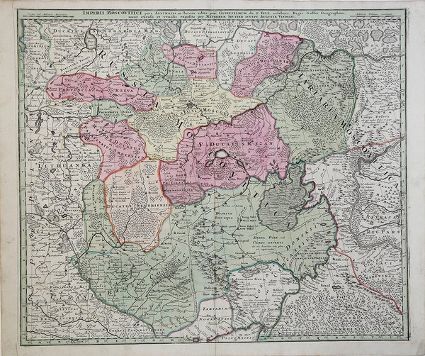 Carta geografica della Russia tratta dal Atlas Novus sive tabulae geographicae totius orbis edito nel 1741. ' Matthäus Seutter (1678 - 1757) fu uno dei più importanti e prolifici editori tedeschi di mappe del XVIII secolo. Attivo, come incisore sotto la tutela dell'importante J. B. Homann. All'inizio del 1700 Seutter lasciò Homann per tornare ad Augusta, dove lavorò per l'importante editore d'arte Jeremia Wolff (1663 - 1724), per il quale incise mappe e altre stampe. Intorno al 1717 fondò la propria casa editrice cartografica indipendente ad Augusta. La maggior parte delle mappe di Seutter sono pesantemente basate, se non addirittura copie, di lavori precedenti fatti dalle calcografie Homann e De L'Isle. Ciononostante, dal 1731/32 Seutter era uno degli editori più prolifici del suo tempo e fu onorato dall'imperatore tedesco Carlo VI che gli diede il titolo di Geografo Imperiale, dopo il quale la maggior parte delle mappe successive includeva la denominazione ' Avec Privilege. ' Seutter continuò a pubblicare fino alla sua morte, all'apice della sua carriera, nel 1757. Acquaforte con coloritura editoriale, in ottimo stato di conservazione. Detailed map of Southern Russia, including the Ukraine, Cosack Regions and the Southern part of Moscovie. Includes towns, roads, rivers, lakes, mountains, castles, forests and other details. Includes parts of Lithuania, and Poland. Shows Moscow, Kiev and other major cities in the region.This is an attractive 1730 map of southern Russia and Ukraine by the important Augsburg map publisher Georg Matthaus Seutter. It depicts from Novgorod south to Lutik and east as far as Kokchaga. Includes towns, roads rivers, lakes, mountains, forests and other details. The map is based on the work of Guillaume Delisle. Mattha?us Seutter (1678 - 1757) was one of the most important and prolific German map publishers of the 18th century. Seutter was born the son of a goldsmith but apprenticed as a brewer. Apparently uninspired by the beer business, Seutter abandoned his apprenticeship and moved to Nuremberg where he apprenticed as an engraver under the tutelage of the prominent J. B. Homann. Sometime in the early 1700s Seutter left Homann to return to Augsburg, where he worked for the prominent art publisher jeremiad Wolff (1663 - 1724), for whom he engraved maps and other prints. Most of Seutter's maps are heavily based upon, if not copies of, earlier work done by the Homann and De L'Isle firms. Nonetheless, by 1731/32 Seutter was one of the most prolific publishers of his time and was honored by the German Emperor Karl VI who gave him the title of Imperial Geographer, after which most subsequent maps included the Avec Privilege designation. ' Copperplate with fine original colouring, good condition. Cfr.