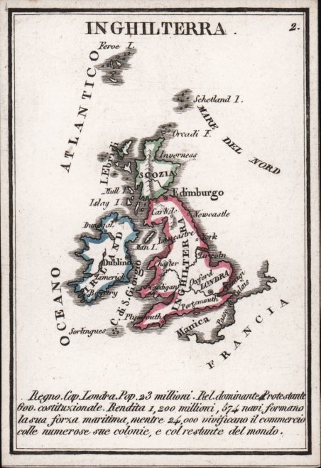 Rara mappa in miniatura tratta dal ' Piccolo Atlante per la Gioventù composte di 40 tavole geografiche con la descrizione delle Superficie, popolazioni, religioni, forma di governo, rendite, armate, ed altre notizie storico statistiche ' di Pietro e Giuseppe Vallardi, stampato a Milano, senza data, ma circa 1830. L'atlante consiste in un titolo e quaranta mappe stampate su carta spessa. Le carte sono divise in quattro serie: Europa, Asia, America e Africa; ogni set contiene nove mappe regionali dei paesi più importanti. Come dice il titolo, ogni mappa fornisce informazioni su geografia, popolazione, religione, governo, entrate e forza militare. Anche se l'atlante non è datato, una data approssimativa può essere accertata dalla mappa di Argentina e Uruguay. Sulla mappa l'Argentina è chiamata ' 'Confederazione del Rio della Plata'. Le Province Unite del Rio de la Plata era il nome iniziale per la nuova Argentina indipendente. Il nome fu abbandonato alla fine del terzo decennio in favore di Argentina. La mappa mostra anche un Uruguay indipendente, quindi dopo il Trattato di Montevideo del 1828. I Vallardi erano una famiglia di rinomati editori milanesi. Al capostipite Francesco (1736-1799) succedettero i figli Pietro, Santo Francesco, Giuseppe e Cesare Paolo. Nel 1812 rimasero in società Pietro (1770-1819) e Giuseppe (1784-1861), che intitolarono (1812) la ditta ai ' Fratelli Vallardi ' distinguendosi nella pubblicazione di libri e stampe d'arte. Dal 1818 Giuseppe, rimasto unico proprietario, diede grande impulso anche al commercio calcografico. Acquaforte, coloritura coeva dei contorni, in ottimo stato di conservazione. Rare miniature map taken from the ' Piccolo Atlante per la Gioventu composte di 40 tavole geografiche con la descrizione delle Superficie, popolazioni, religioni, forma di governo, rendite, armate, ed altre notizie storico statistiche ' by Pietro & Giuseppe Vallardi, published in Milan, circa 1830. The atlas consists of a title and forty maps each printed on thick card. The cards are divided into four sets: Europe, Asia, America, and Africa; with each set containing nine regional maps of the most prominent countries. As the title states, each map gives information upon the geography, population, religion, government, revenues and military strength. ' Although the atlas is not dated, an approximate date maybe ascertained from the map of Argentina and Uruguay. Upon the map Argentina is named the ' ?‘Confederazione del Rio della Plata’. The United Provinces of Rio de la Plata was an early name for the newly independent Argentina. The name was dropped by the end of the 1820s in favour of Argentina. The map also shows an independent Uruguay, which gained its independence at the Treaty of Montevideo in 1828. The Vallardis were a family of renowned Milanese publishers. The progenitor Francesco (1736-1799) was succeeded by his sons Pietro, Santo Francesco, Giuseppe, and Cesare Paolo. In 1812 Pietro (1770-1819) and Giuseppe (1784-1861) remained in partnership, naming (1812) the firm the ' Fratelli Vallardi, distinguishing themselves in the publication of art books and prints. From 1818 Giuseppe, who remained the sole owner, also gave great impetus to the intaglio trade. Etching, contemporary coloring of the outlines, in very good condition. Cfr.